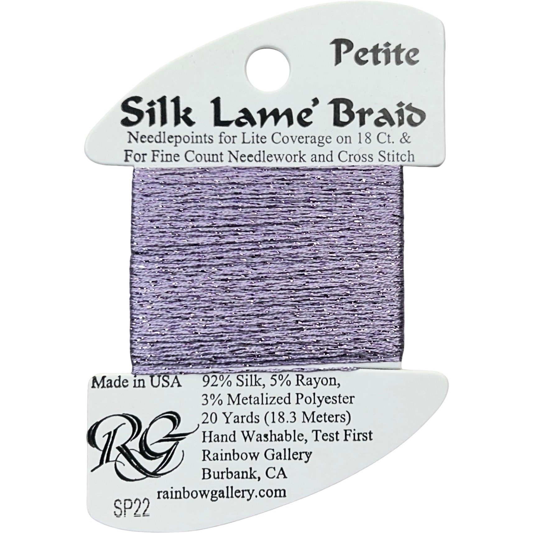 This is Silk Lame Braid Petite from Rainbow Gallery in color 022 Lavender. Use on 18 mesh for light coverage, or with a floss as a blending filament. 2 strands of Silk Lame Braid Petite are approximately equivalent to one strand of Silk Lame Braid 18.