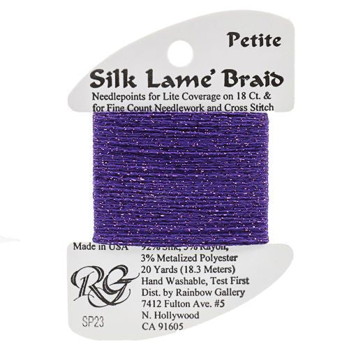 This is Silk Lame Braid Petite from Rainbow Gallery in color 023 Dark Lavender. Use on 18 mesh for light coverage, or with a floss as a blending filament. 2 strands of Silk Lame Braid Petite are approximately equivalent to one strand of Silk Lame Braid 18.