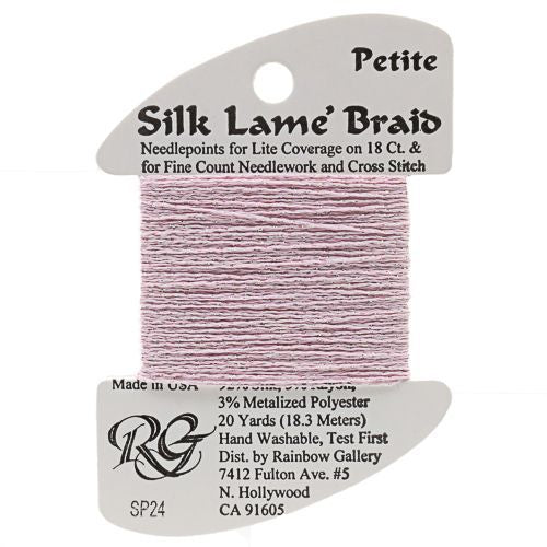 This is Silk Lame Braid Petite from Rainbow Gallery in color 024 Baby Pink. Use on 18 mesh for light coverage, or with a floss as a blending filament. 2 strands of Silk Lame Braid Petite are approximately equivalent to one strand of Silk Lame Braid 18.