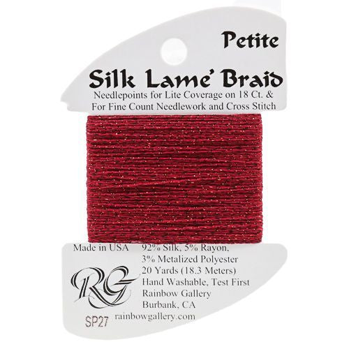 This is Silk Lame Braid Petite from Rainbow Gallery in color 027 Garnet. Use on 18 mesh for light coverage, or with a floss as a blending filament. 2 strands of Silk Lame Braid Petite are approximately equivalent to one strand of Silk Lame Braid 18.