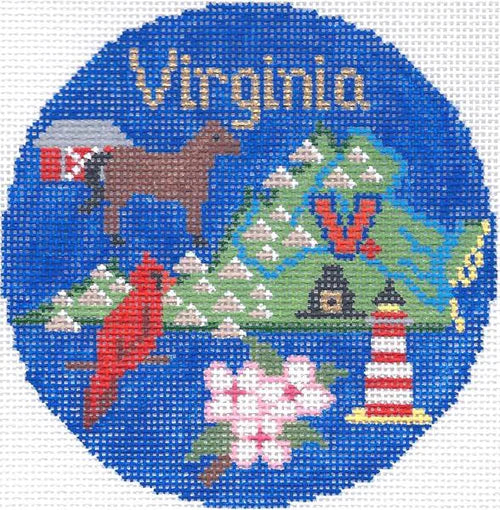 A beautiful hand painted needlepoint canvas from Silver Needle. These destination ornaments needlepoint canvases by Silver Needle are great mementos for places special to you This one is for the state of Virginia.