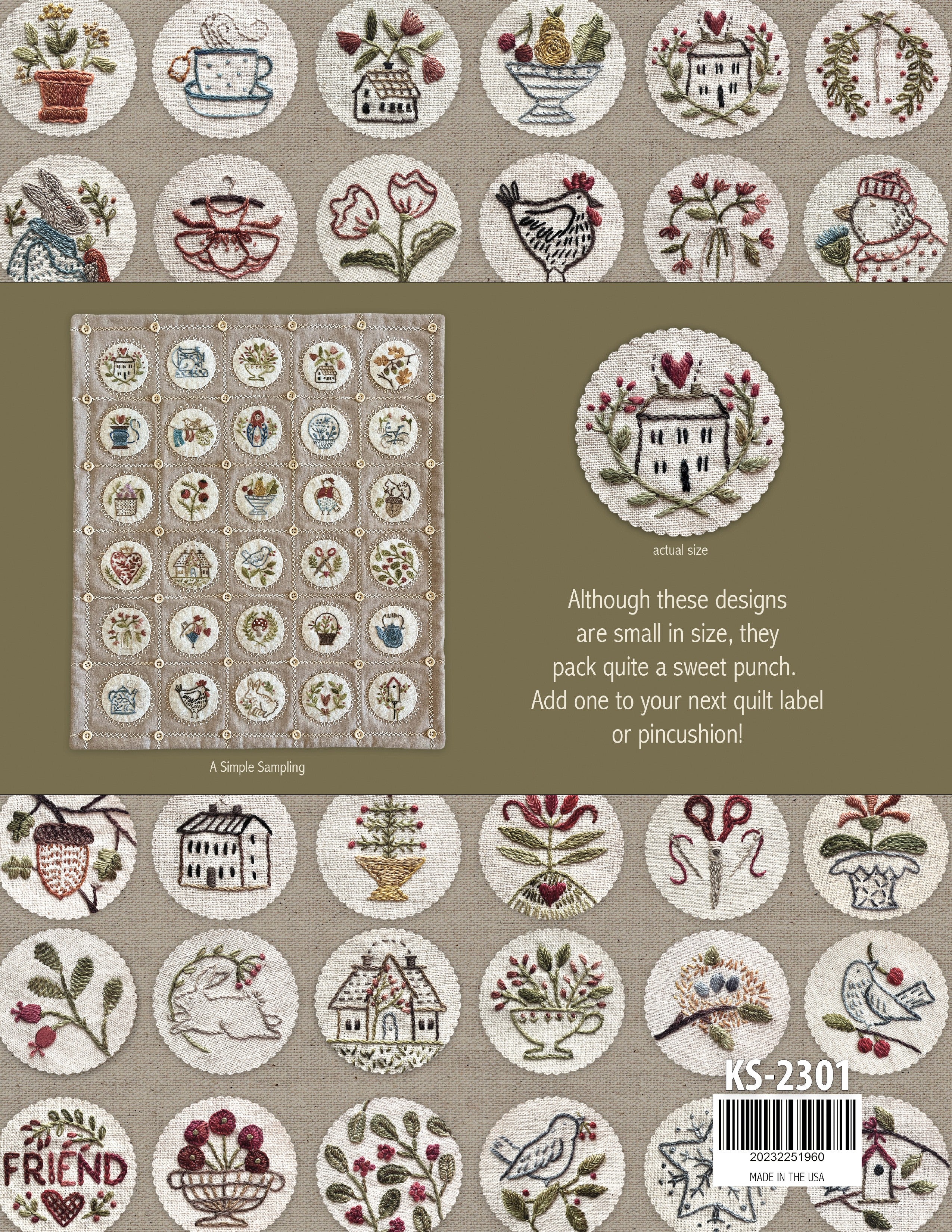 These 64 miniature hand embroidery designs by Kathy Schmidt stitch up fast and add so much fun to your next project! The book includes directions for making a small hanging and three pincushion patterns. Each design fits nicely within a 2" circle and most fit in a 1" hexagon.