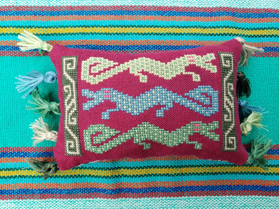 This is a printed cross stitch pattern by Siren Stitchworks. It features a collection of five designs inspired by Mexican folk art. These designs include a dragon, a bird, an alligator, a horse, and a cat. As stitched, the example uses DMC threads on 32 and 36 ct linen fabrics.