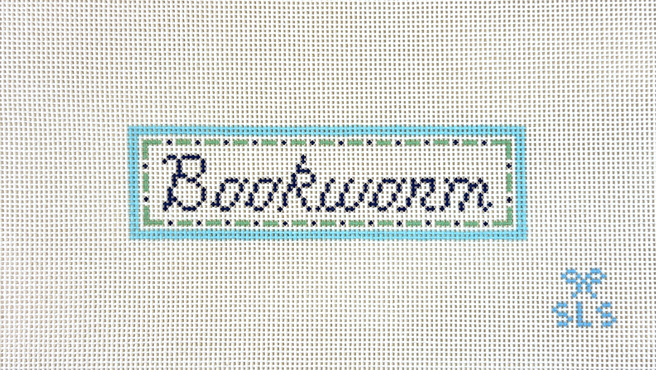 This is a hand painted needlepoint canvas by SLS Needlepoint. It features the text "Bookworm" in black script with a patterned border in pale greens and blues.