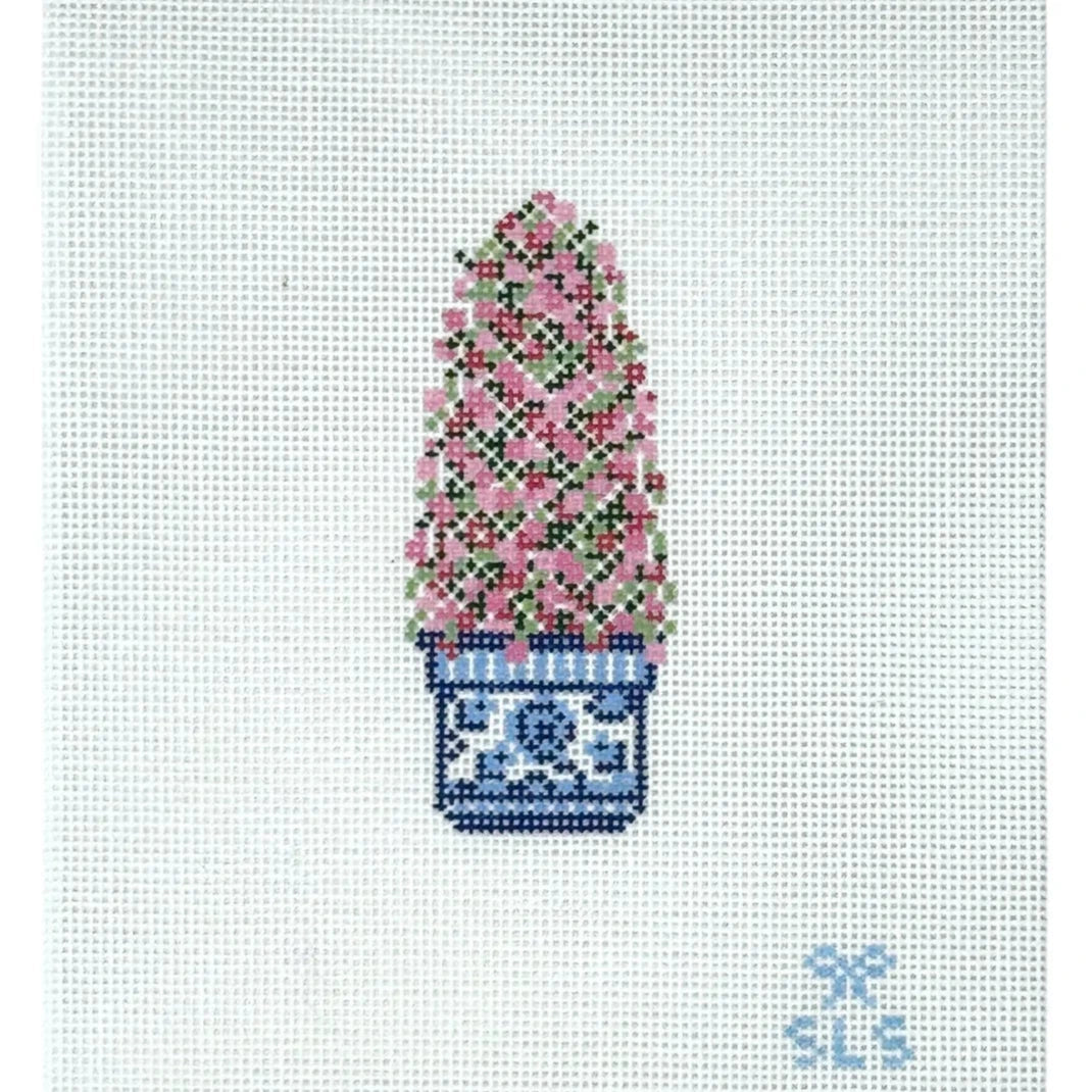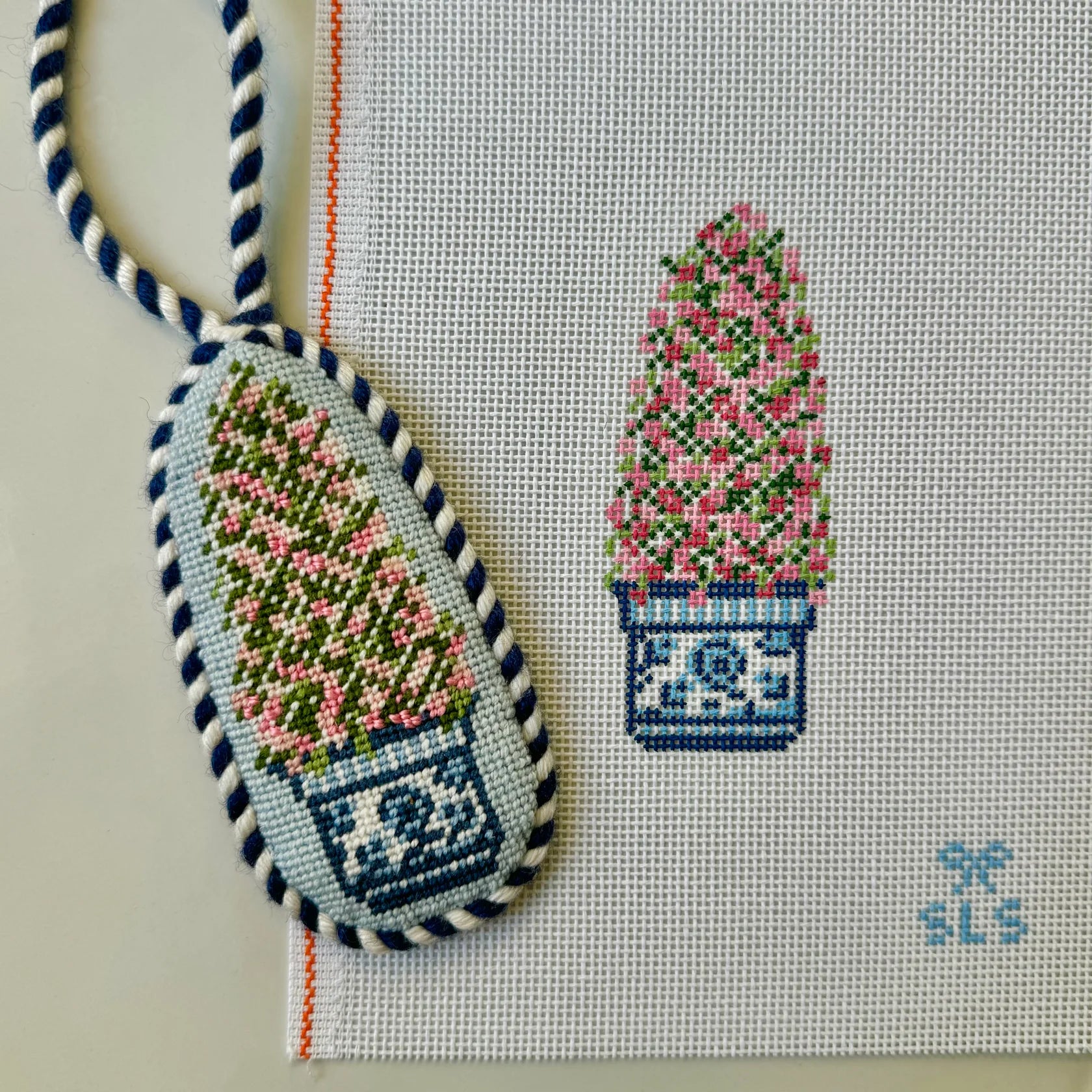 This is a hand painted needlepoint canvas by SLS Needlepoint. It features a rose-covered trellis in a blue and white chinoiserie vase. Stitched example shown for inspiration, materials and finishing services sold separately.