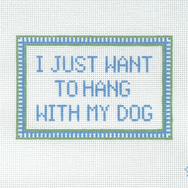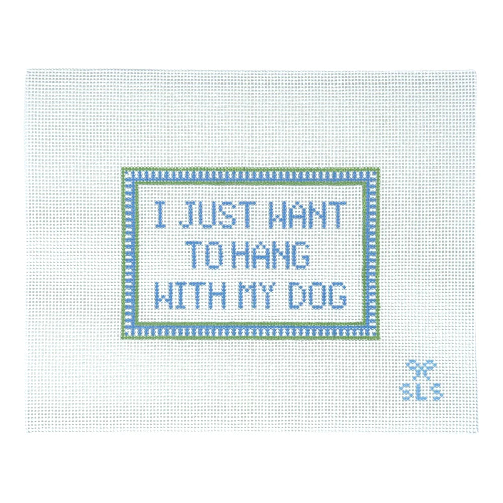 This hand painted needlepoint canvas from SLS Needlepoint says "I just want to hang with my dog".