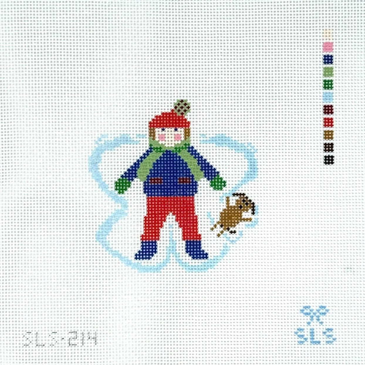 This is a hand painted needlepoint canvas by SLS Needlepoint. It features a little boy in blue making a snow angel accompanied by a teeny dog.