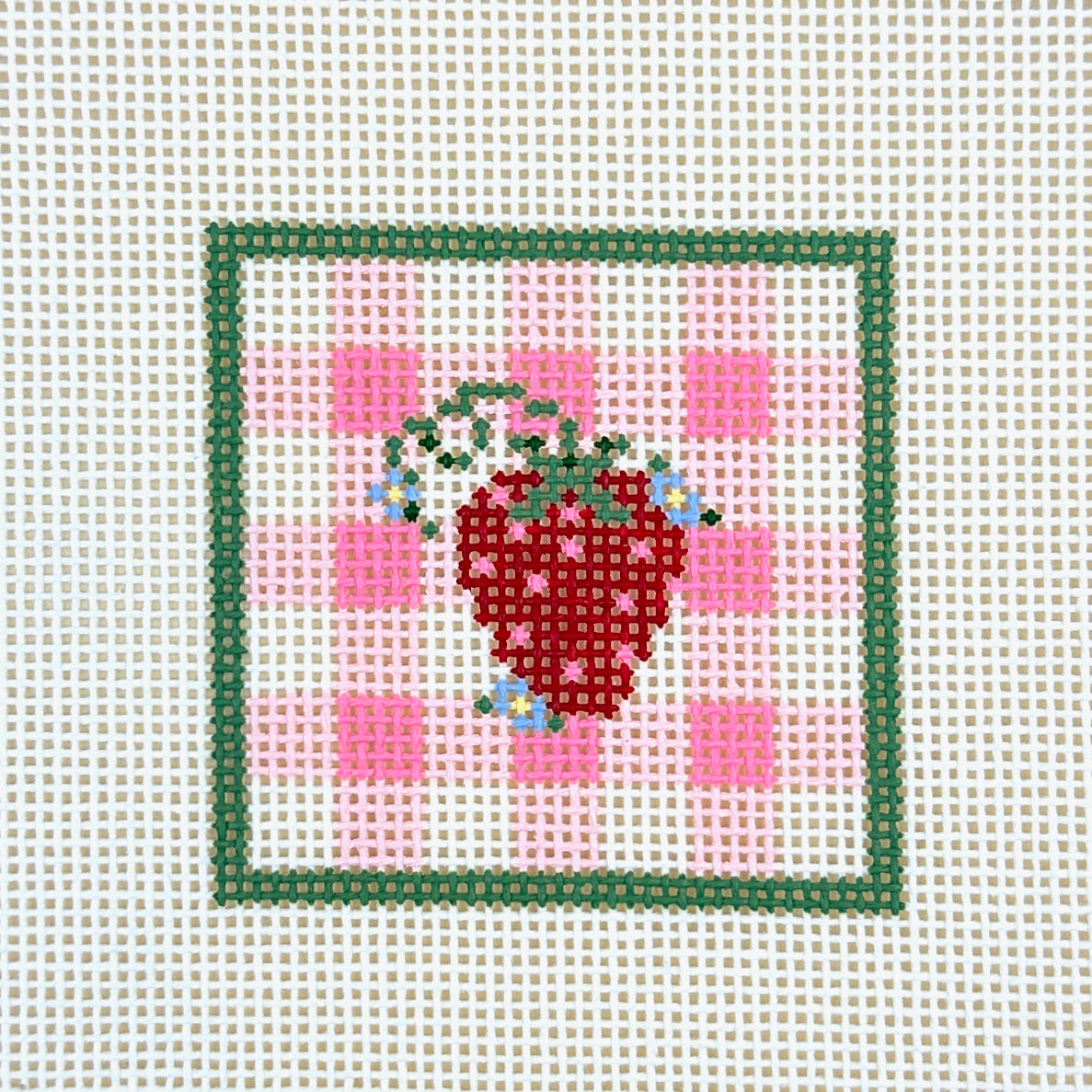 This is a hand painted needlepoint canvas from SLS Needlepoint featuring a petite strawberry on a pink gingham background.
