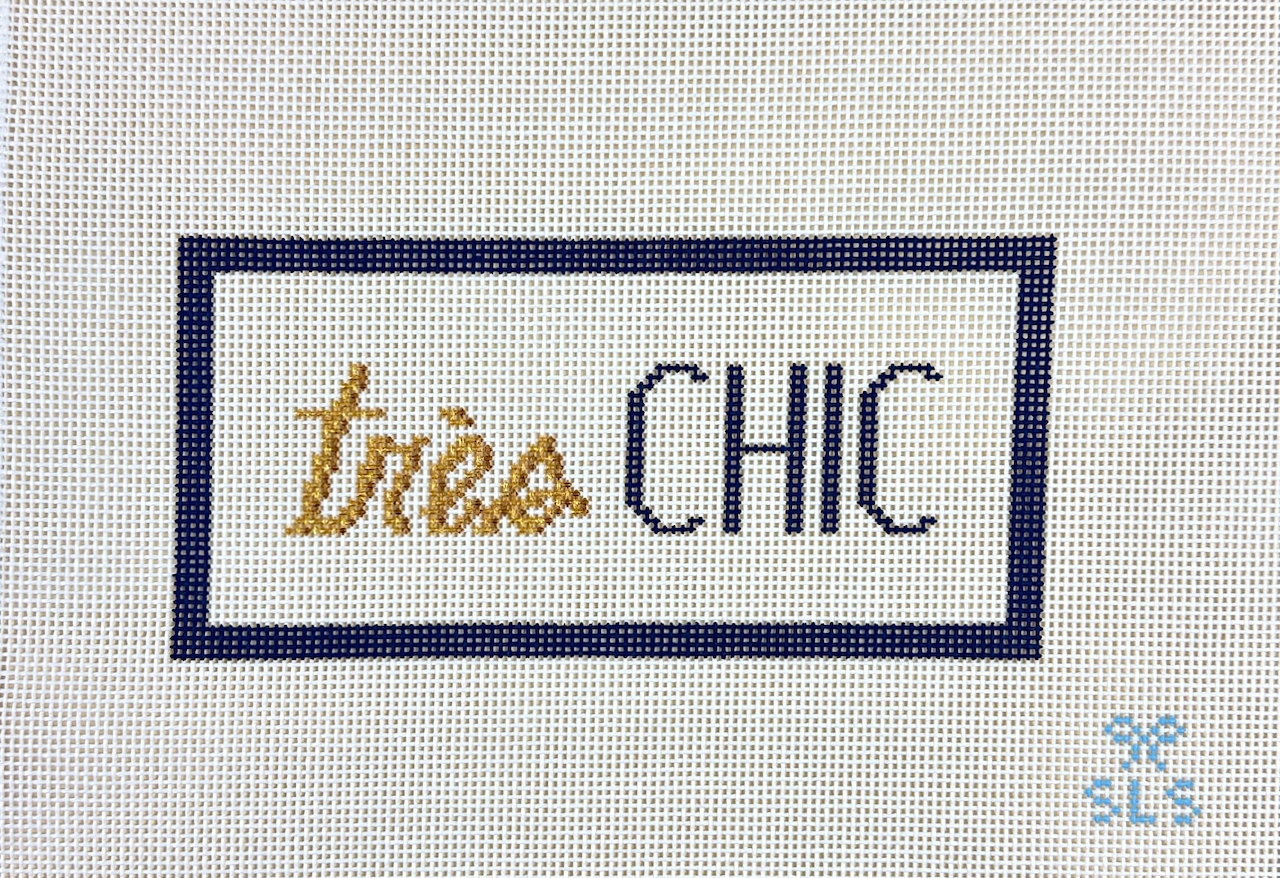 This is a hand painted needlepoint canvas by SLS Needlepoint. It features the text "Tres Chic" in navy and gold and can be finished for a glasses case.