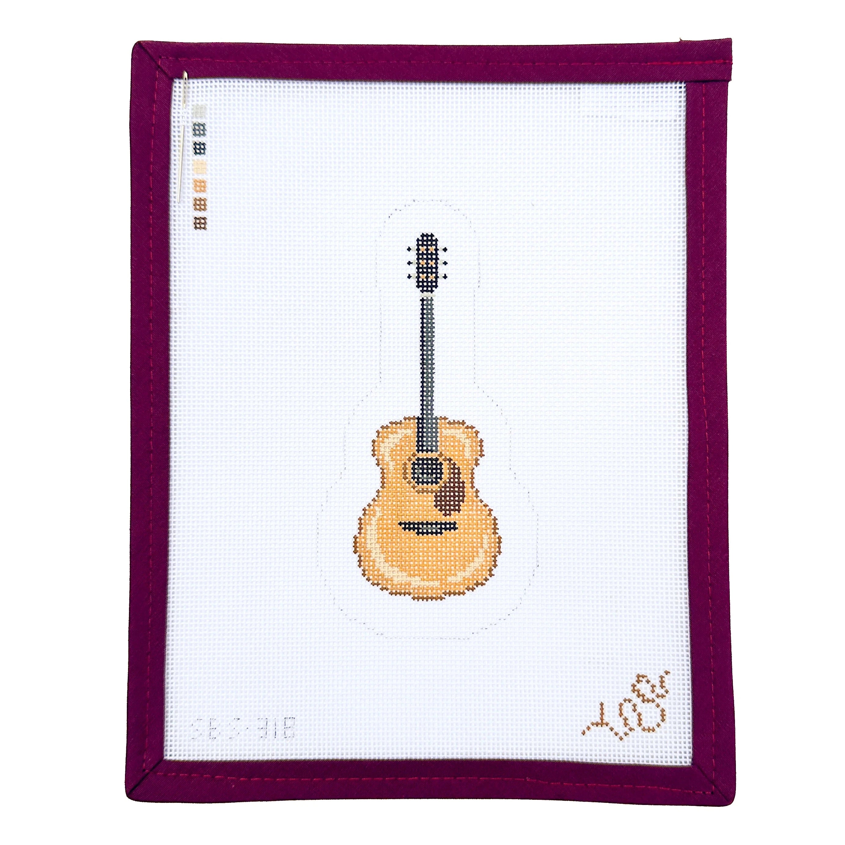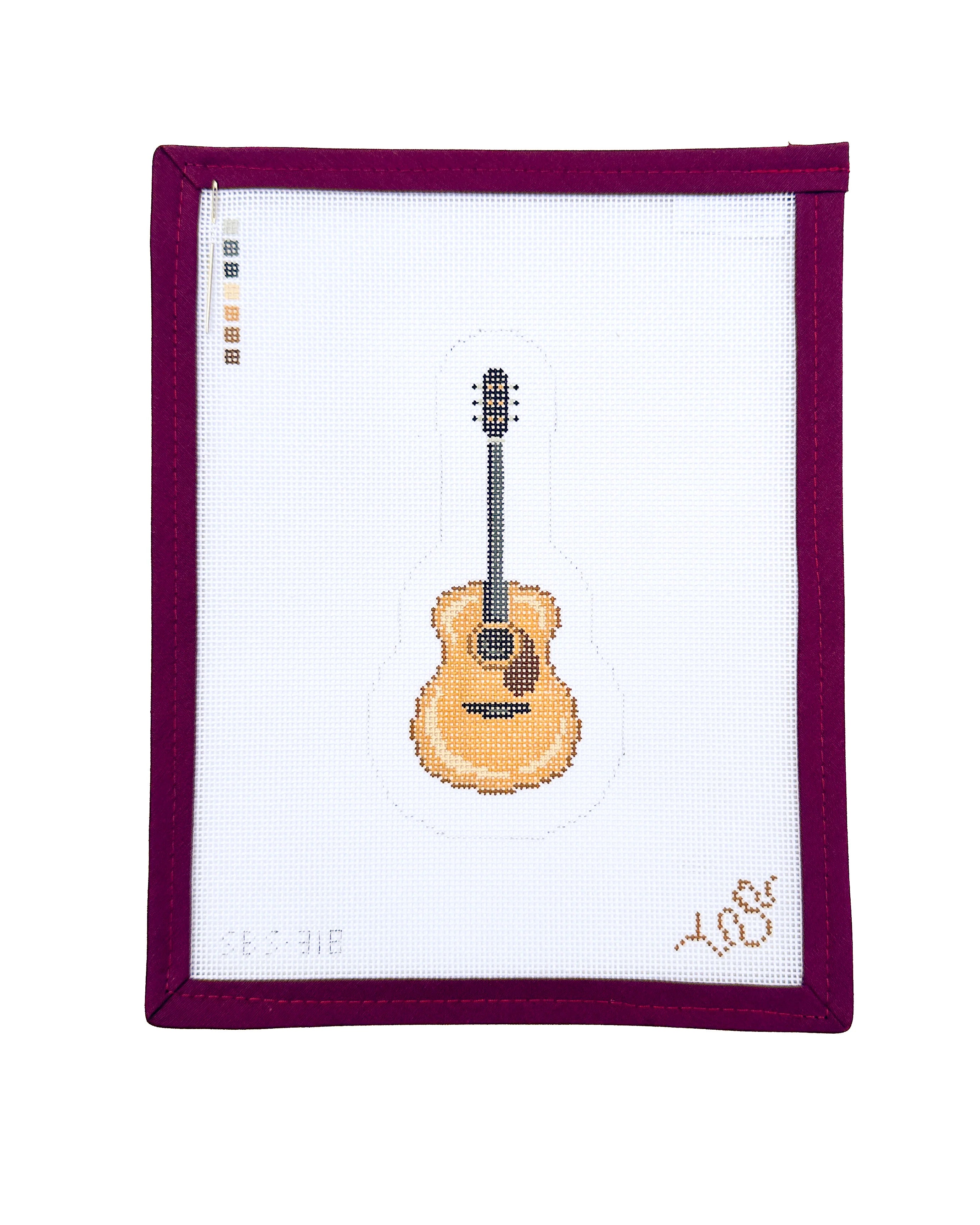This is a hand painted needlepoint canvas by Spellbound Stitchery. It features a painting of an acoustic guitar, and is part of their Instrument series.
