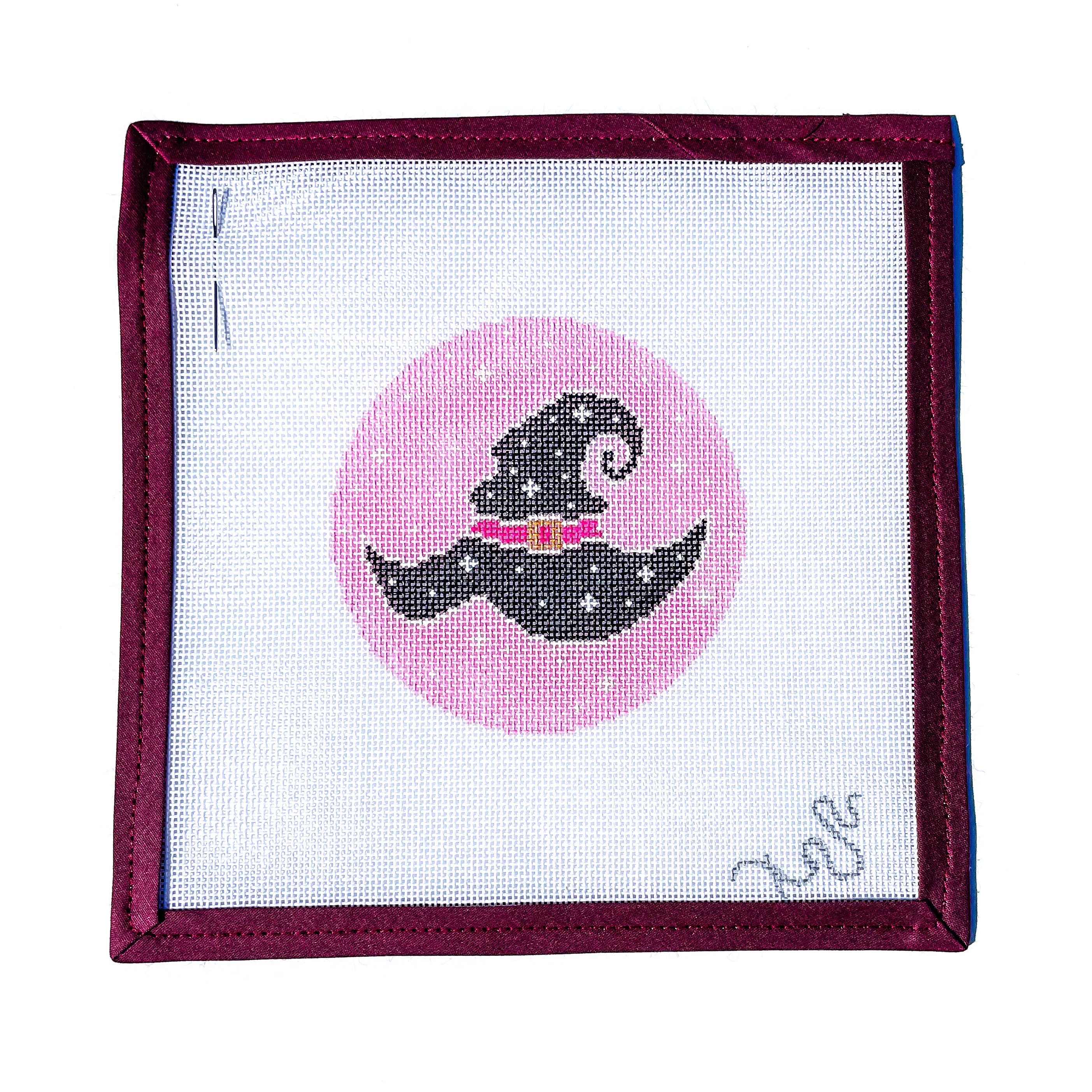 This hand painted needlepoint canvas by Spellbound Stitchery features a witch hat silhouette with celestial design.