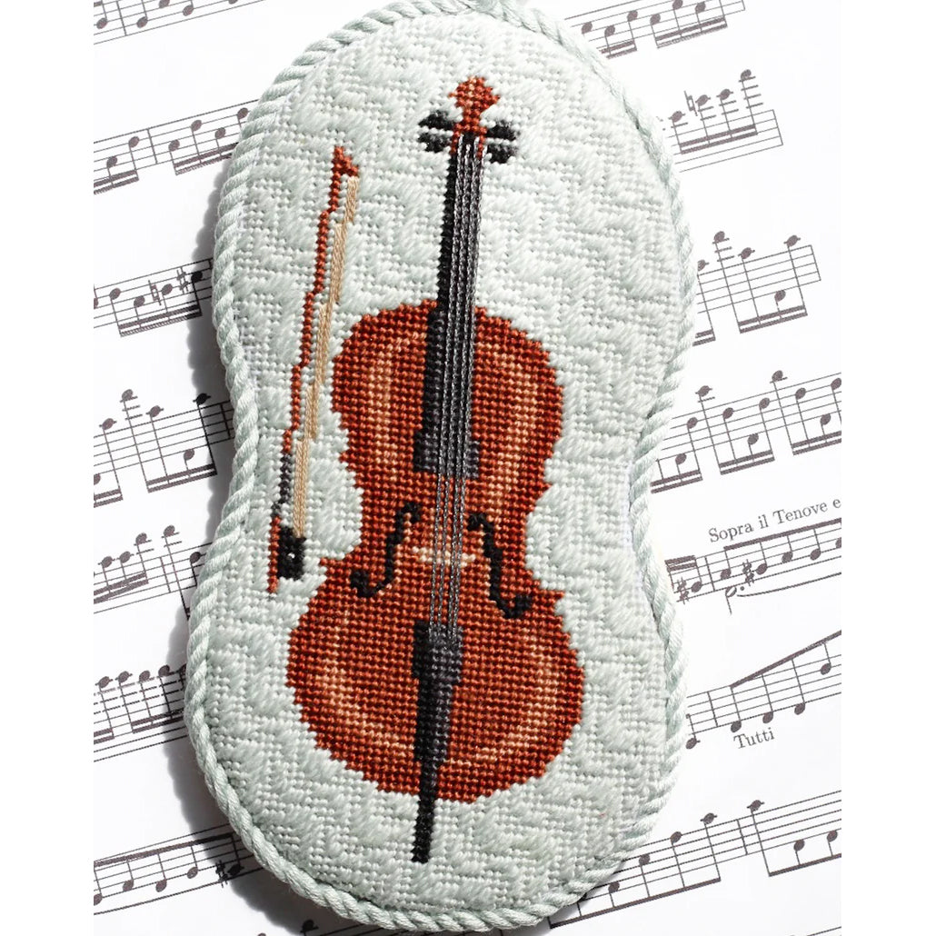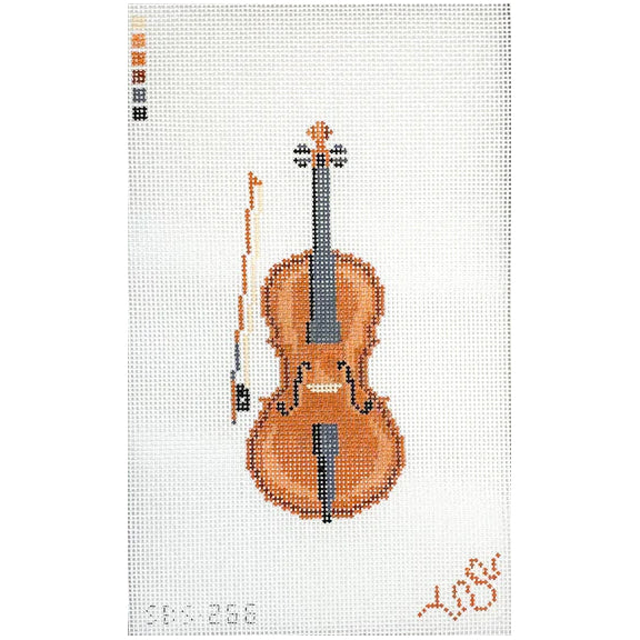 This is a hand painted needlepoint canvas by Spellbound Stitchery. It features an upright cello and bow.