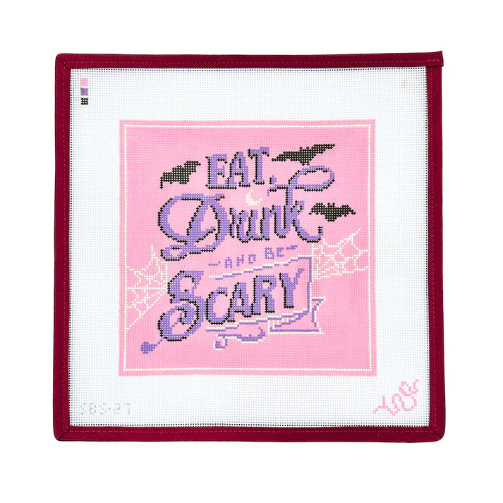 This is a hand painted needlepoint canvas by Spellbound Stitchery. It features a Halloween themed text design stating to "Eat, Drink, and Be Scary".