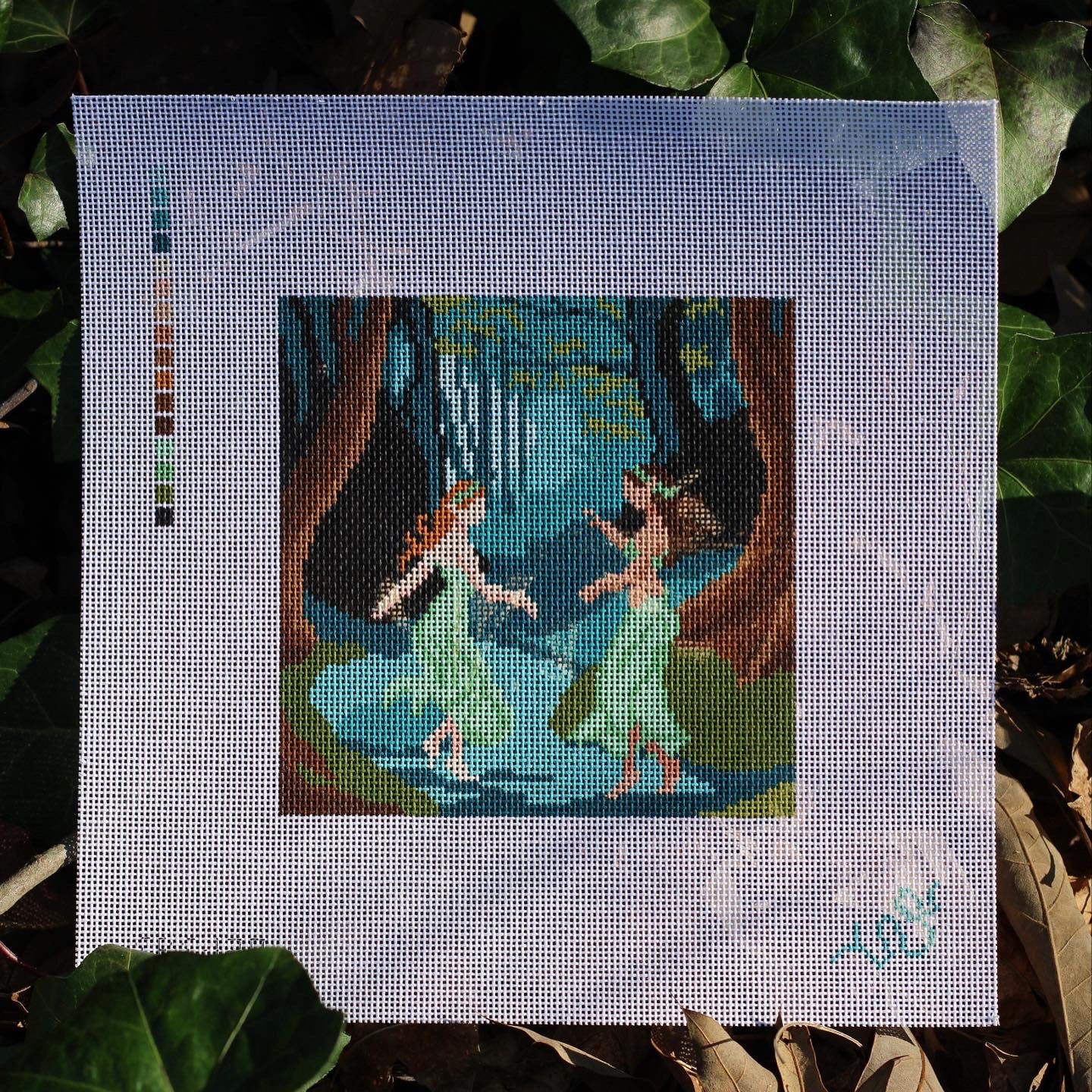 This hand painted needlepoint canvas by Spellbound Stitchery features two dancing dryads celebrating the return of spring, sheltered from prying eyes and safe in the security of sisterhood and nature! A dryad, in Greek mythology, is a nymph or nature spirit who lives in trees and takes the form of a beautiful young woman. It was believed that they lived only as long as the trees they inhabited.