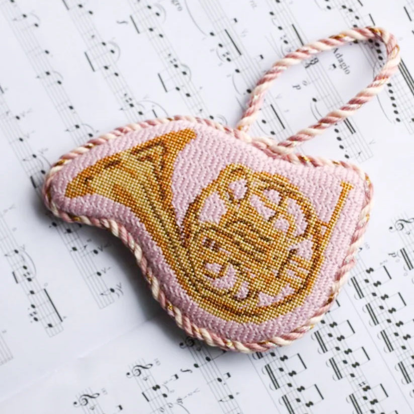 This is a hand painted needlepoint canvas by Spellbound Stitchery. It features a brass French horn.