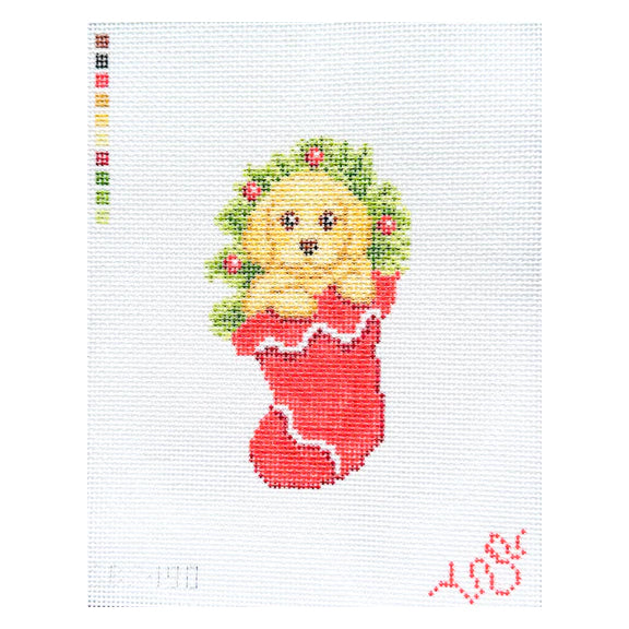 This is a hand painted needlepoint canvas by Spellbound Stitchery. It features an adorable Golden Lab puppy popping out of a festive Christmas stocking, as part of Spellbound's Puppies In Stockings series.
