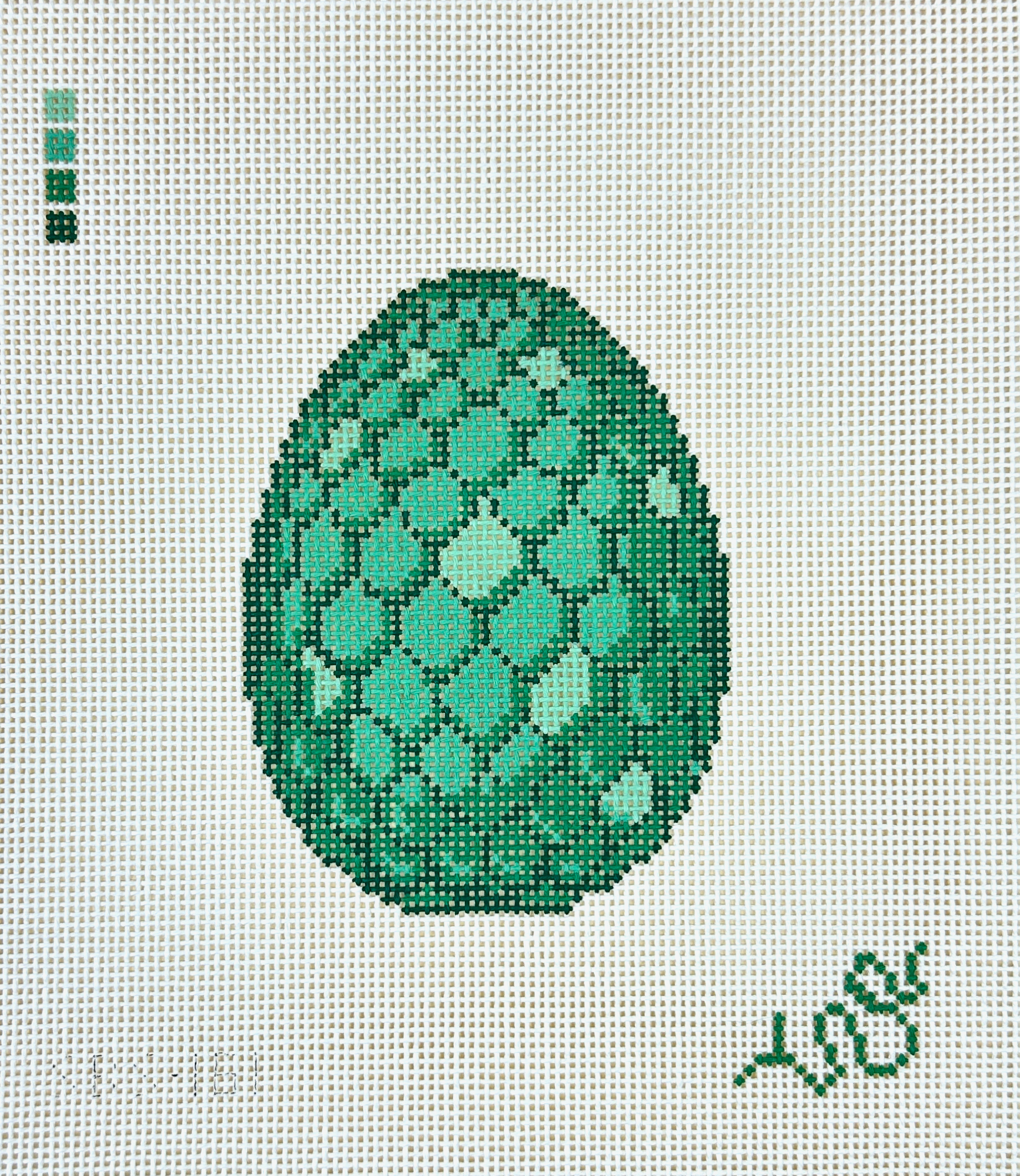 This is a hand painted needlepoint canvas by Spellbound Stitchery. It features a painting of a jade colored dragon egg.