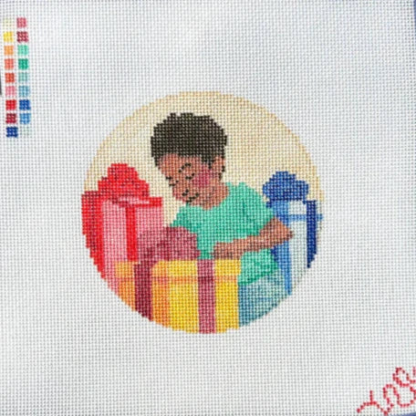 This is a hand painted needlepoint canvas from Spellbound Stitchery working in collaboration with Kat Clayton. It features a painting of a boy with his presents, and represents their shared desire to bring representation to needlepoint. This collection is the first of many such efforts.