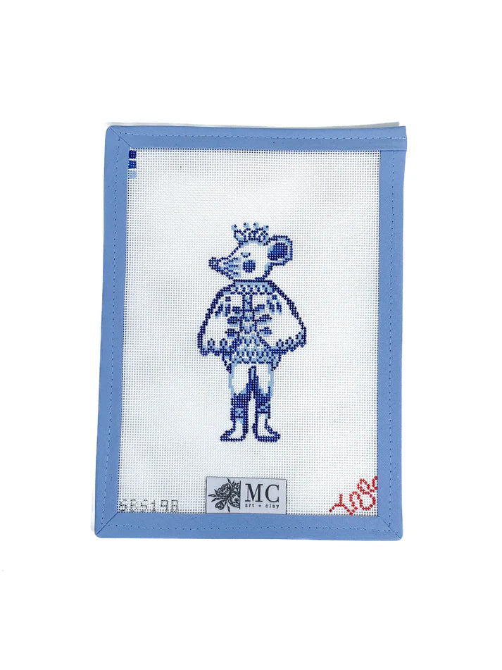 This is a hand painted needlepoint canvas by Maryfrances Carter from Spellbound Stitchery. It features a painting of a mouse dressed in a king's attire.