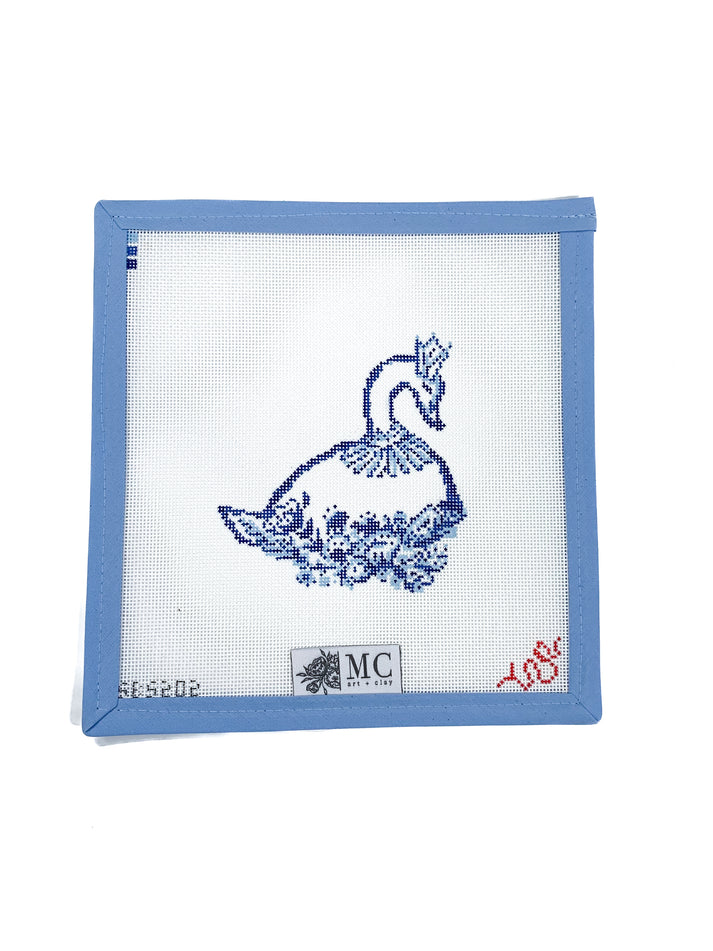 This is a hand painted needlepoint canvas by Maryfrances Carter from Spellbound Stitchery. It features a painting of a swan.