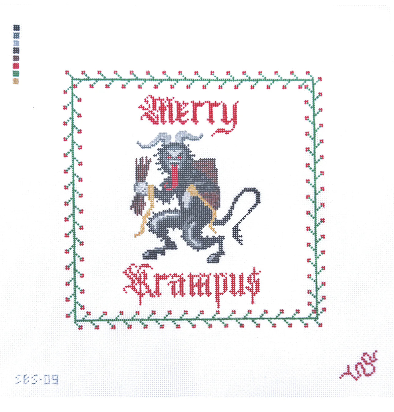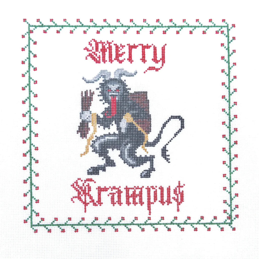 This hand painted needlepoint canvas by Spellbound Stitchery features Krampus a horned, anthropomorphic figure in Central and Eastern Alpine folklore. During the Christmas season, Krampus scares children who have misbehaved. Assisting Saint Nicholas, or Santa Claus, the pair visit children on the night of December 5th, with Saint Nicholas rewarding the well-behaved children with modest gifts such as oranges, dried fruit, walnuts and chocolate, while the badly behaved ones only receive punishment from Krampus with birch rods.