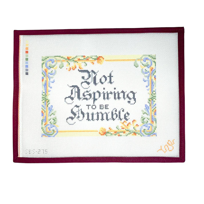 This is a hand painted needlepoint canvas by Spellbound Stitchery. It features a painting of a sign set within a floral frame which states "not aspiring to be humble".