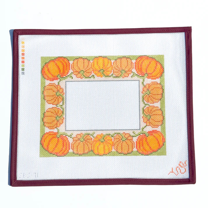 This is a hand painted needlepoint canvas by Spellbound Stitchery. It features a painting of a frame made out of small pumpkins.