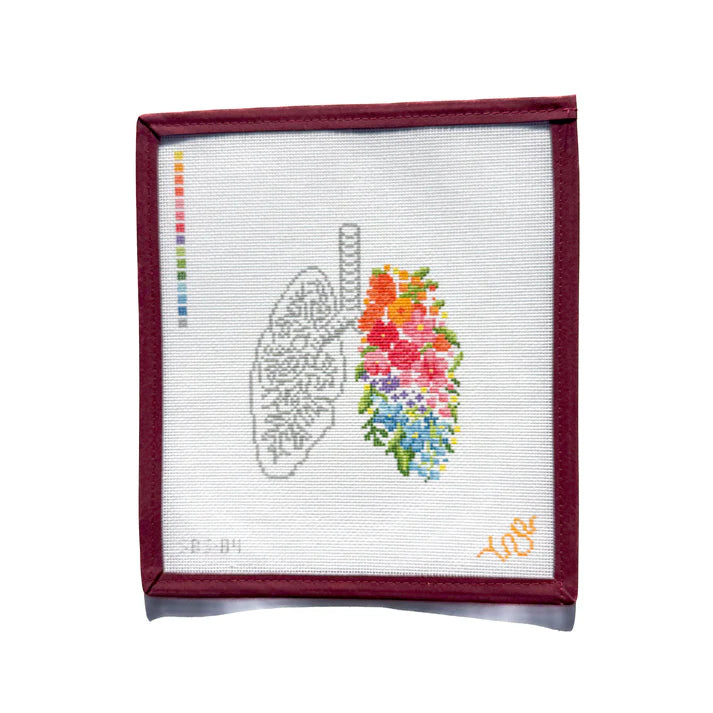 This is a hand painted needlepoint canvas by Spellbound Stitchery. It features a painting of a pair of lungs, one of which has become overgrown with flowers.