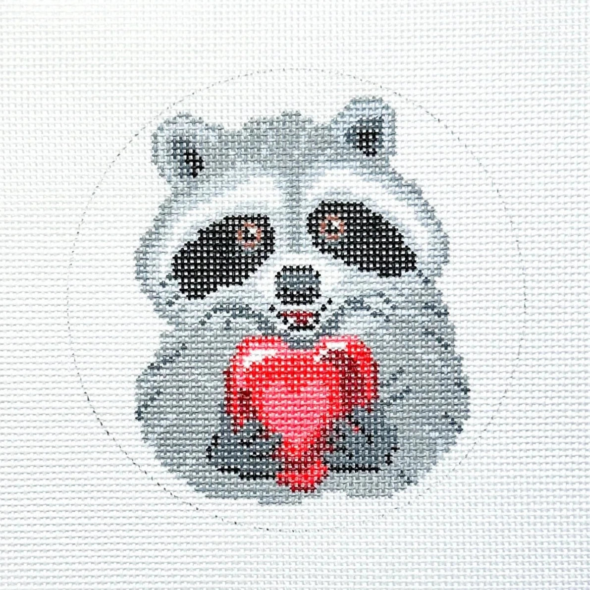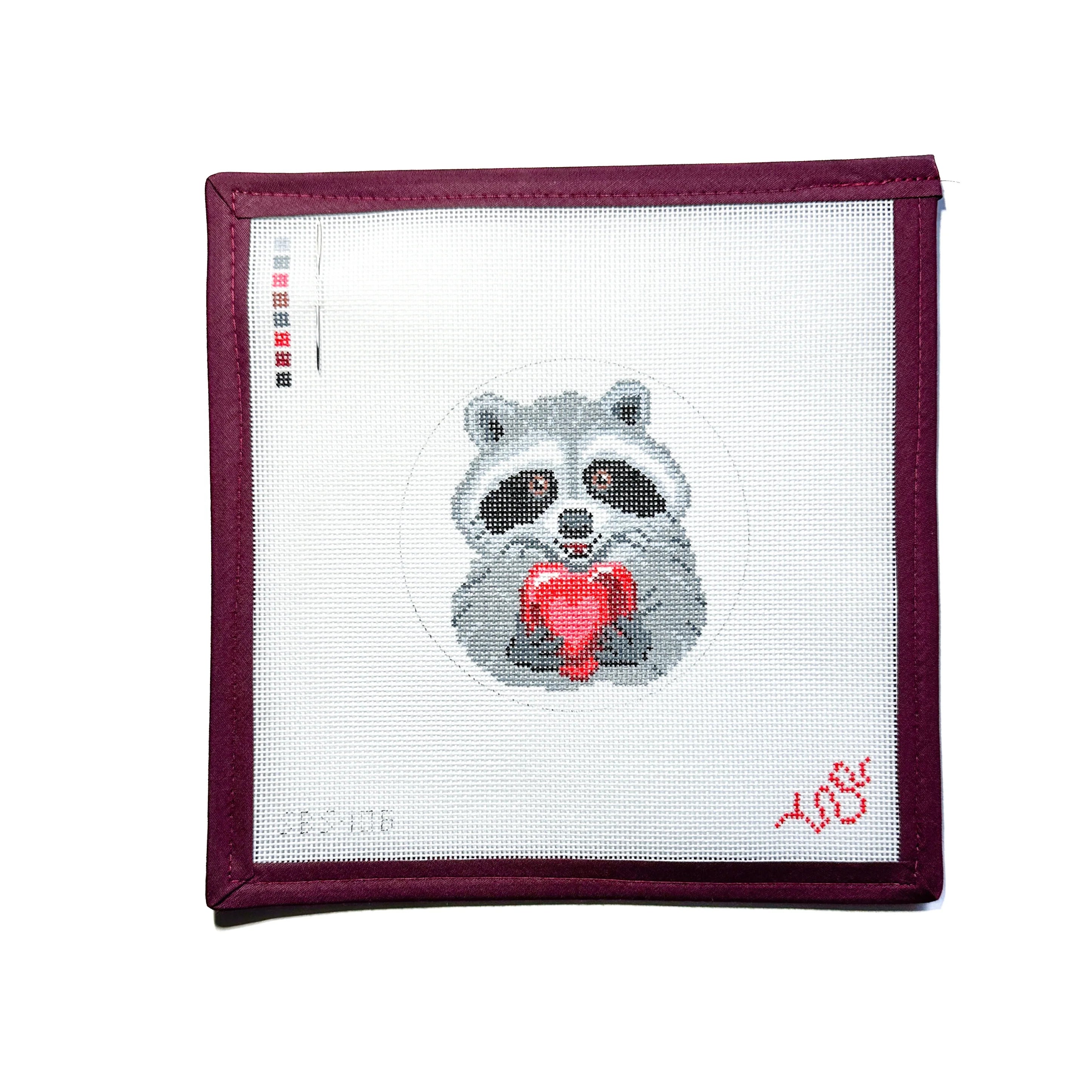 This is a hand painted needlepoint canvas by Spellbound Stitchery. It features a sweet springtime raccoon in a lovely flower crown, as part of Spellbound's Holiday Raccoon series. Stitched example shown for inspiration, materials sold separately.