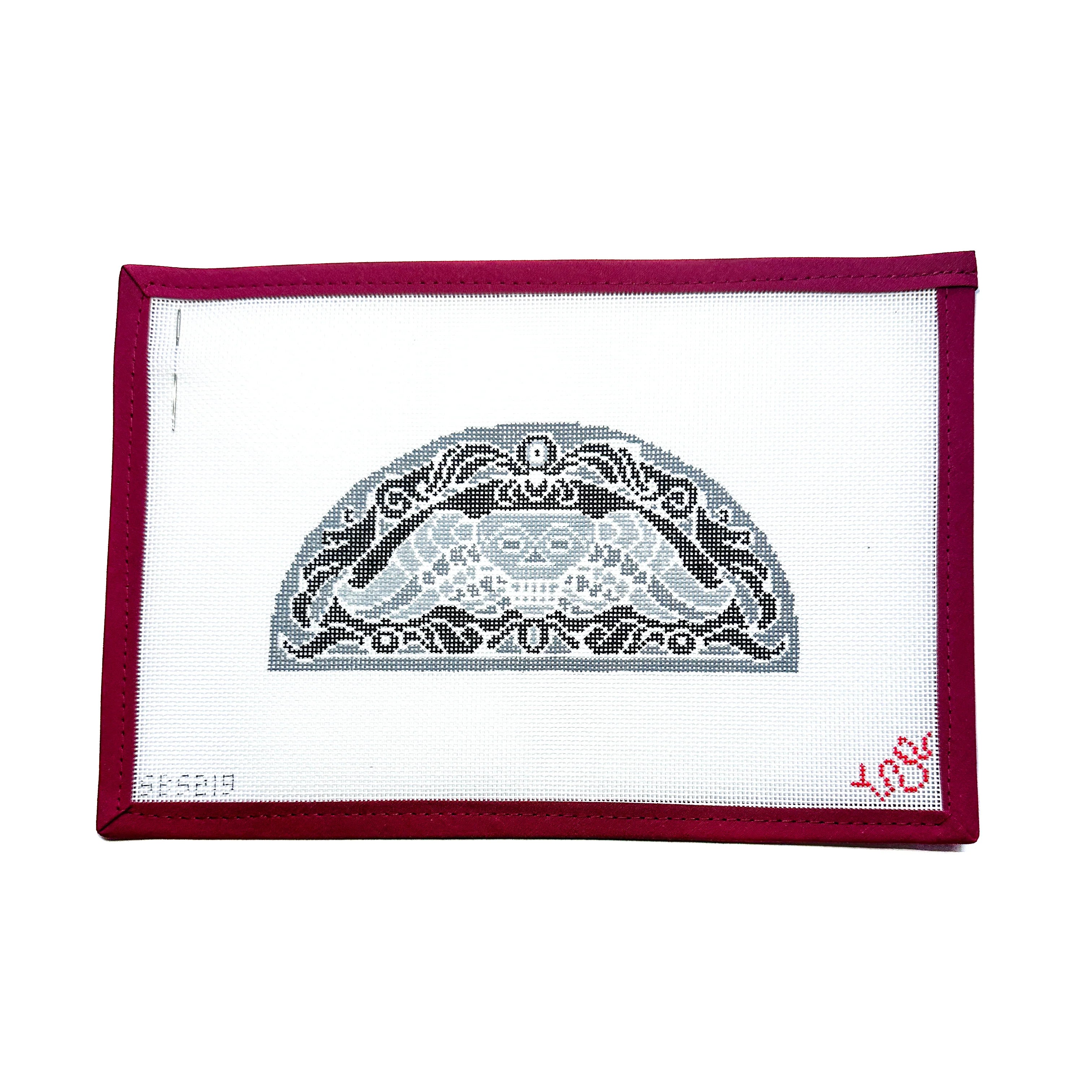 This is a stitch printed needlepoint canvas from Spellbound Stitchery. It features a print of the popular Puritan-era headstone style.