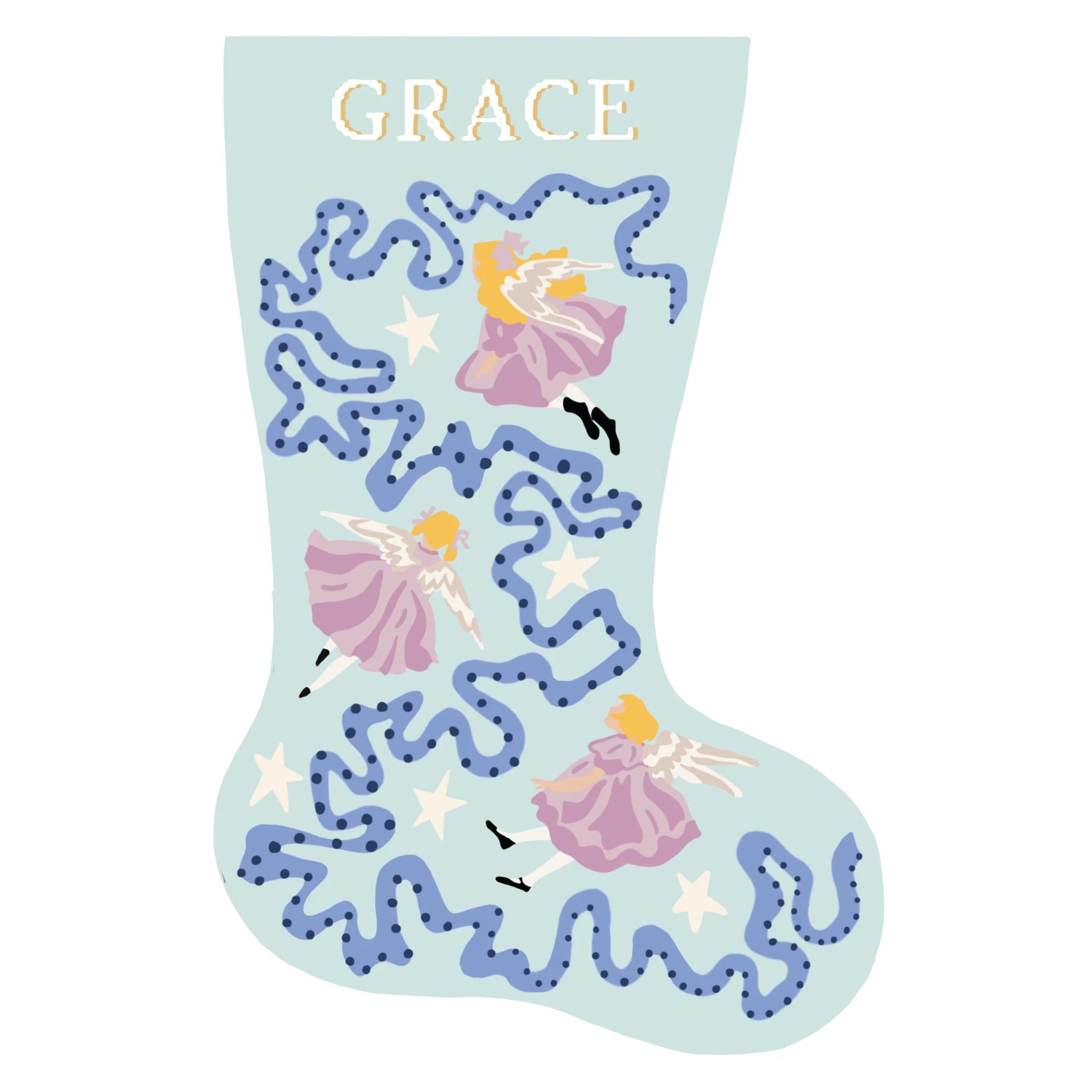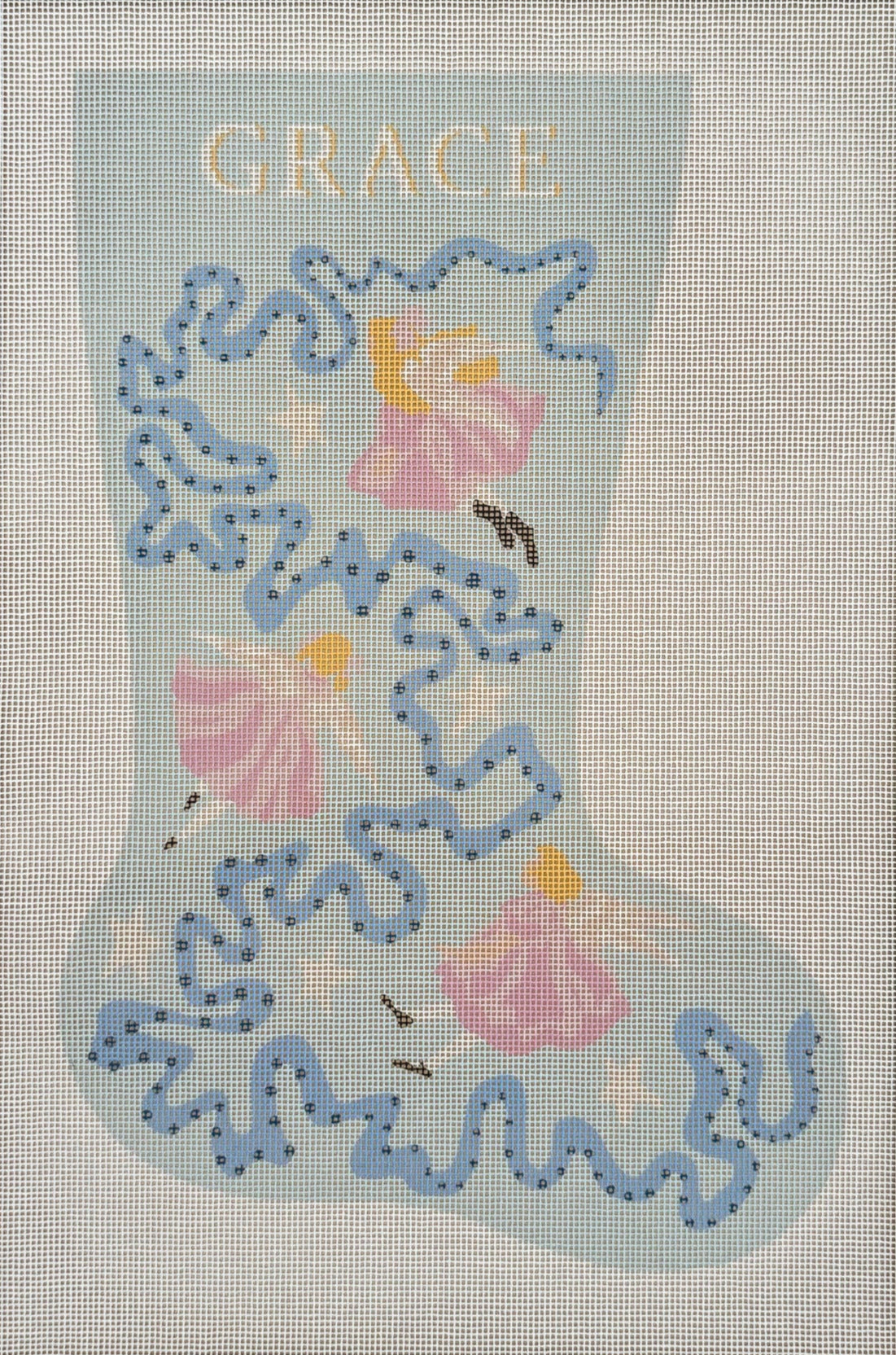 This stitch printed needlepoint stocking canvas from Spider Spun features three angels soaring across this pastel stocking, delivering tidings of comfort and joy amongst the stars.