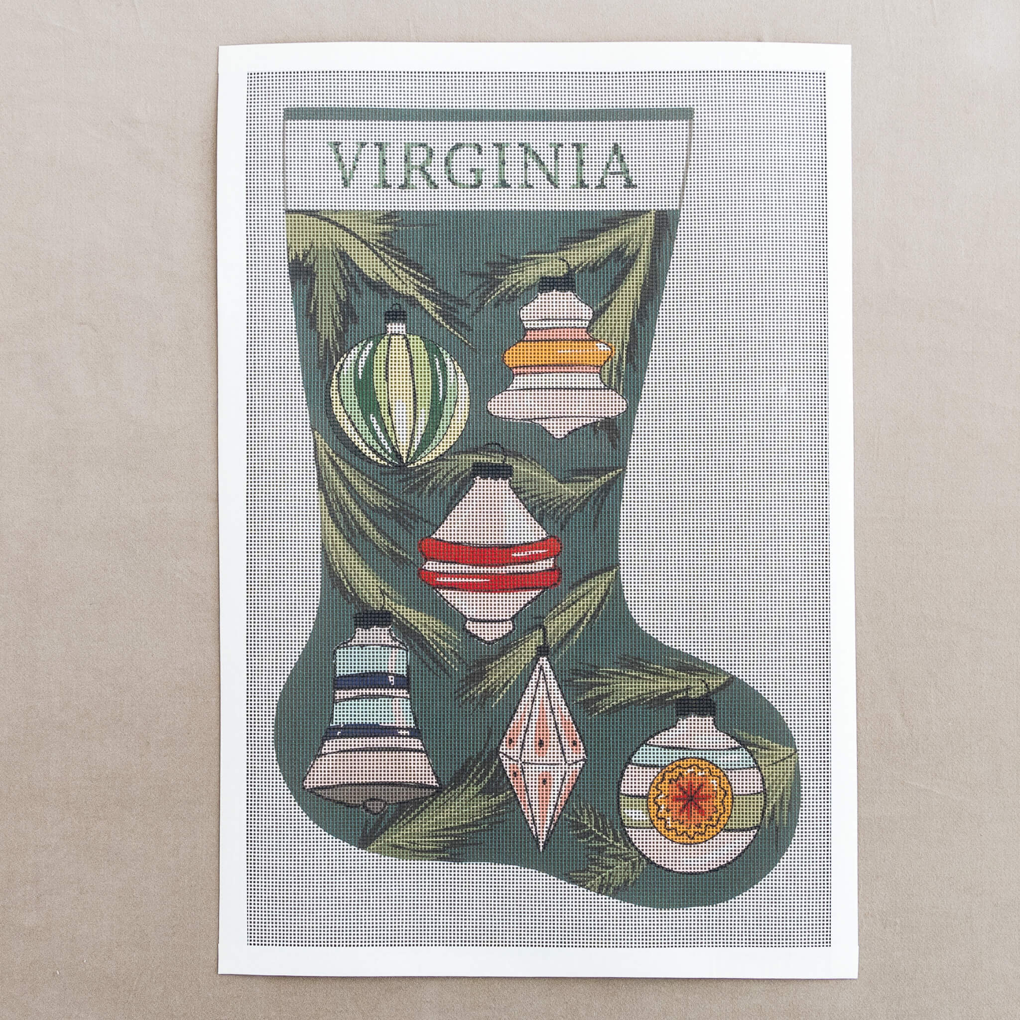 This stitch printed needlepoint stocking canvas from Spider Spun features vintage trimmings and colorful Christmas decorations.