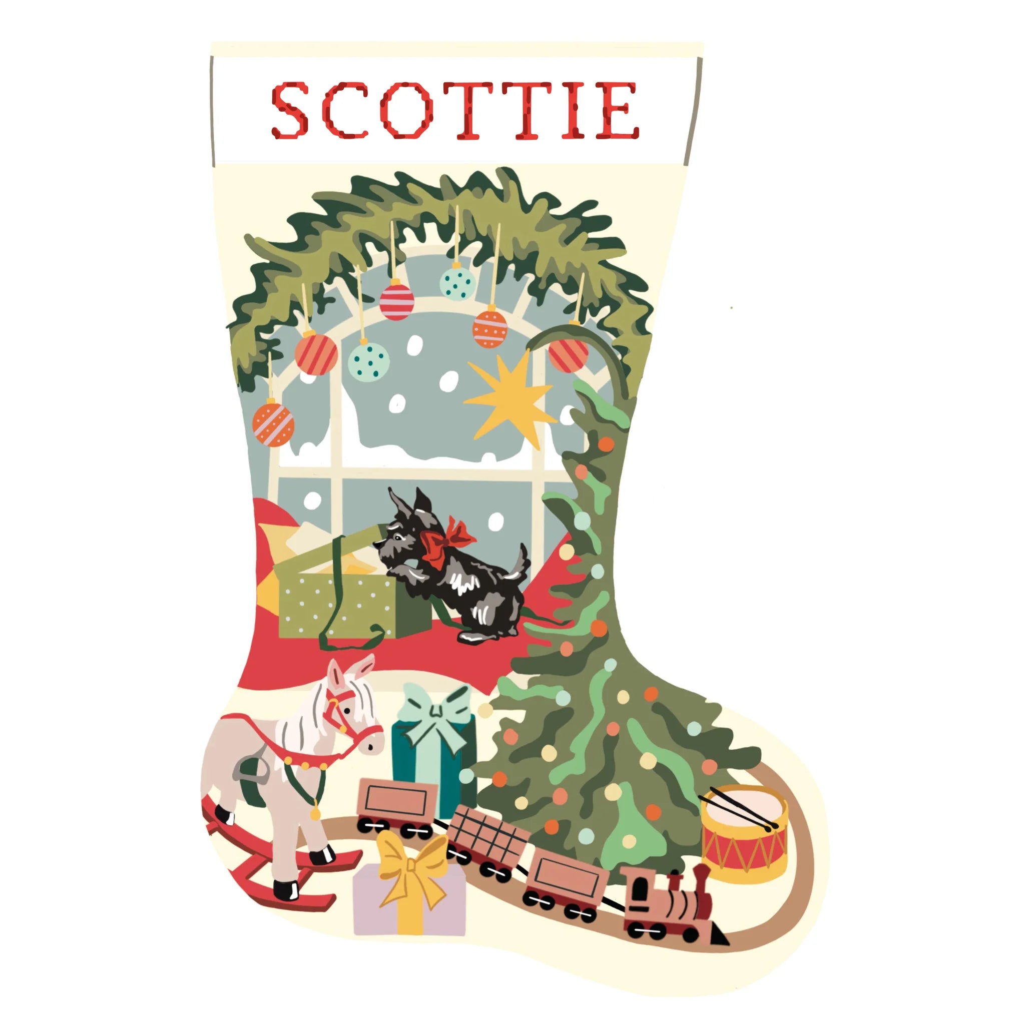 This stitch printed needlepoint stocking canvas from Spider Spun features a festive toy store after hours with a mischievous dog unwrapping a gift and a variety of classic toys that await eager little hands.