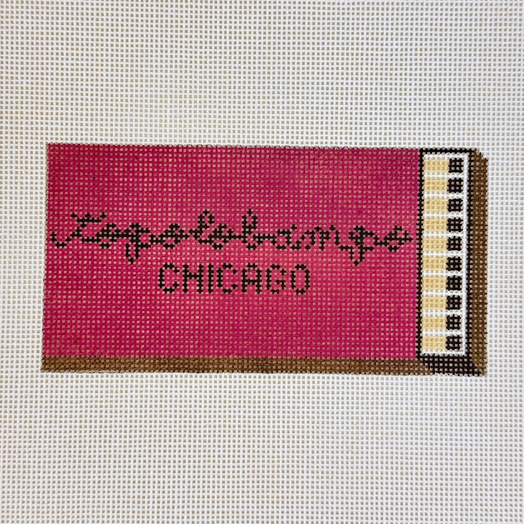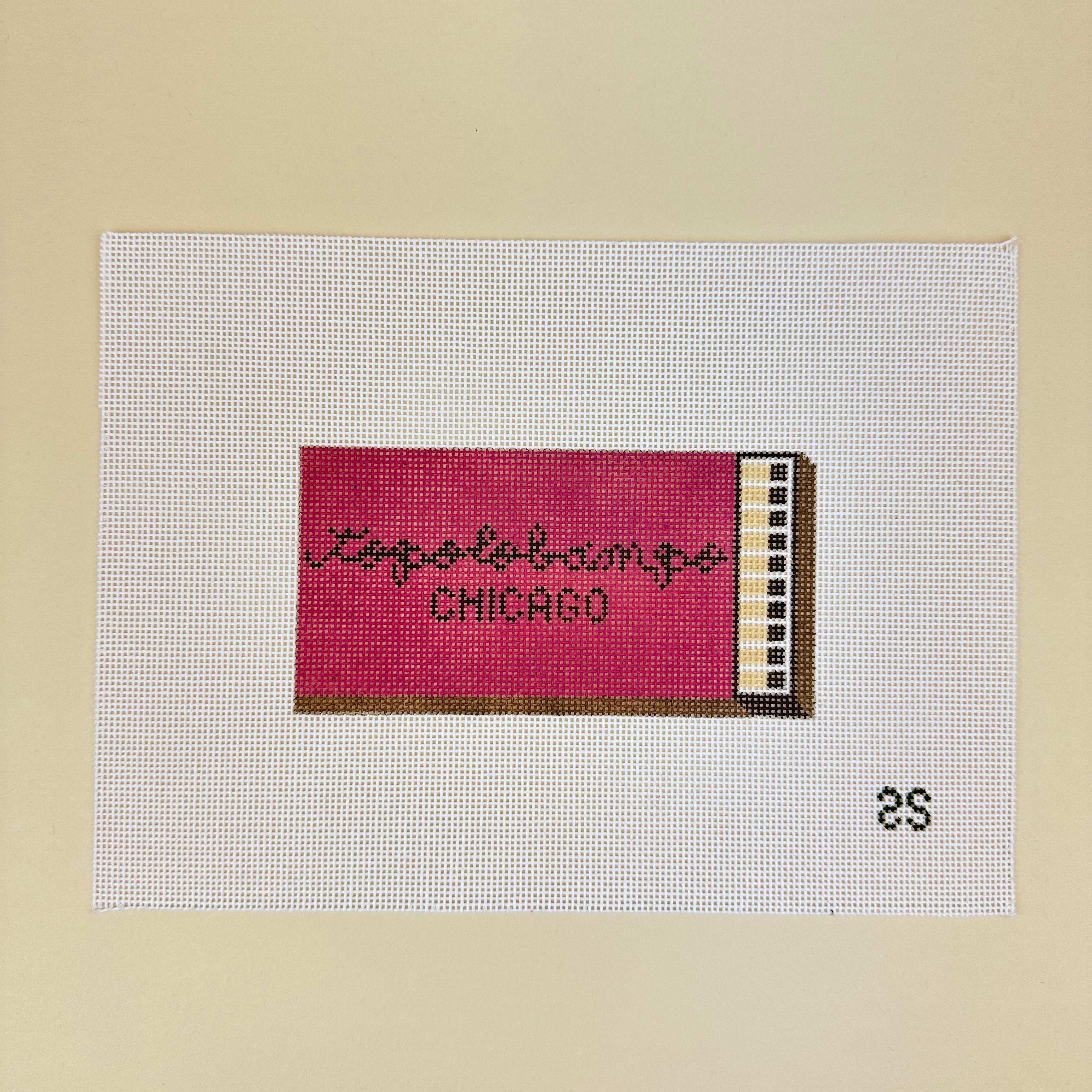 This hand painted needlepoint canvas by Spruce St Studio features a matchbook from Topolobompo in Chicago.