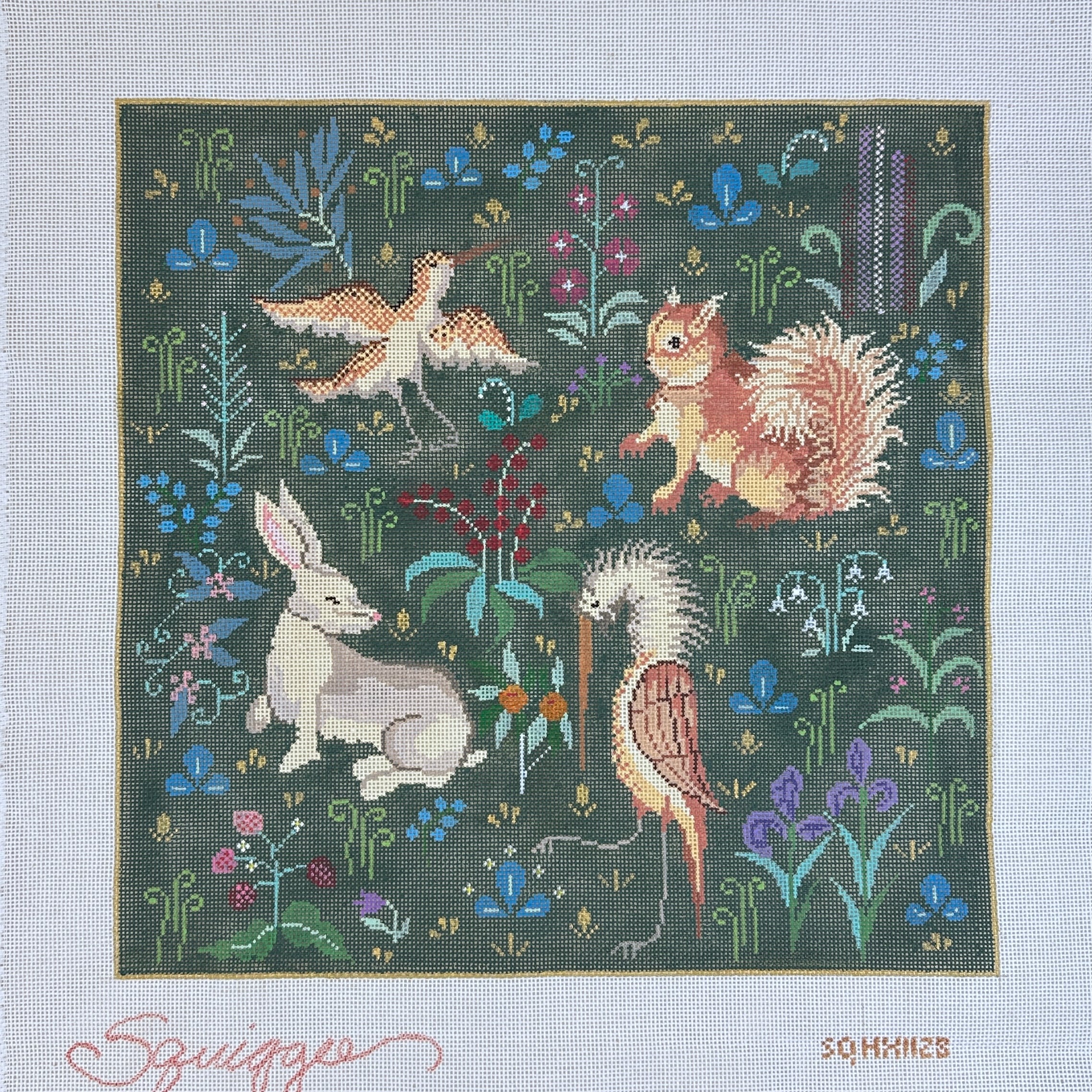 A beautiful hand painted needlepoint design from Squiggee Designs featuring woodland animals inspired by the Cluny tapestries.