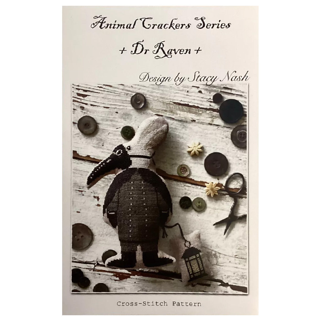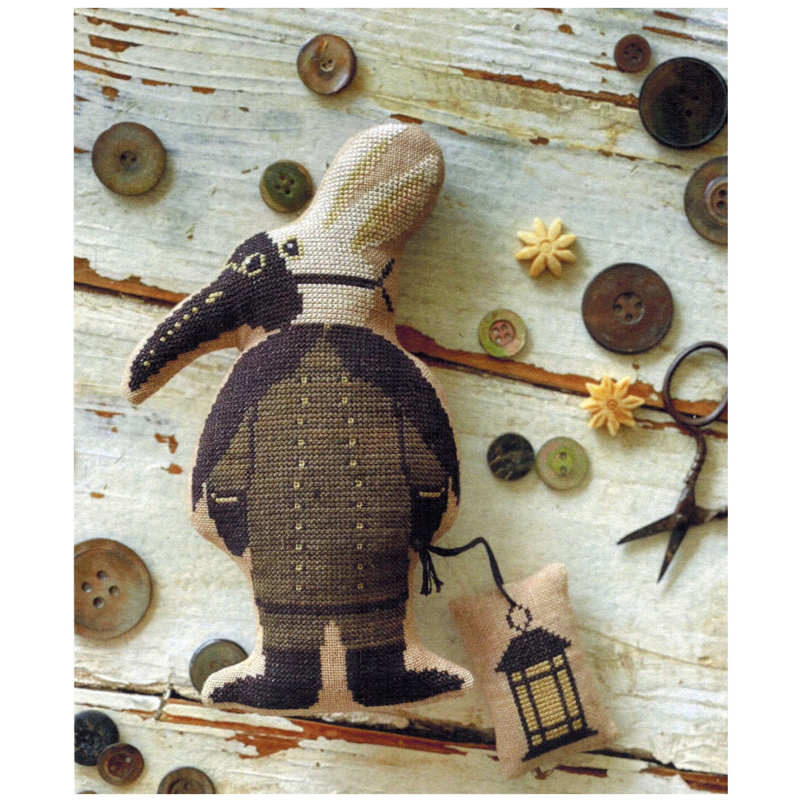 This is a printed cross stitch pattern by Stacy Nash. It features a bunny dressed as a raven and includes a little lantern, finishable as a separate piece. The example is stitched on 35 ct linen and uses Weeks Dye Works Floss.