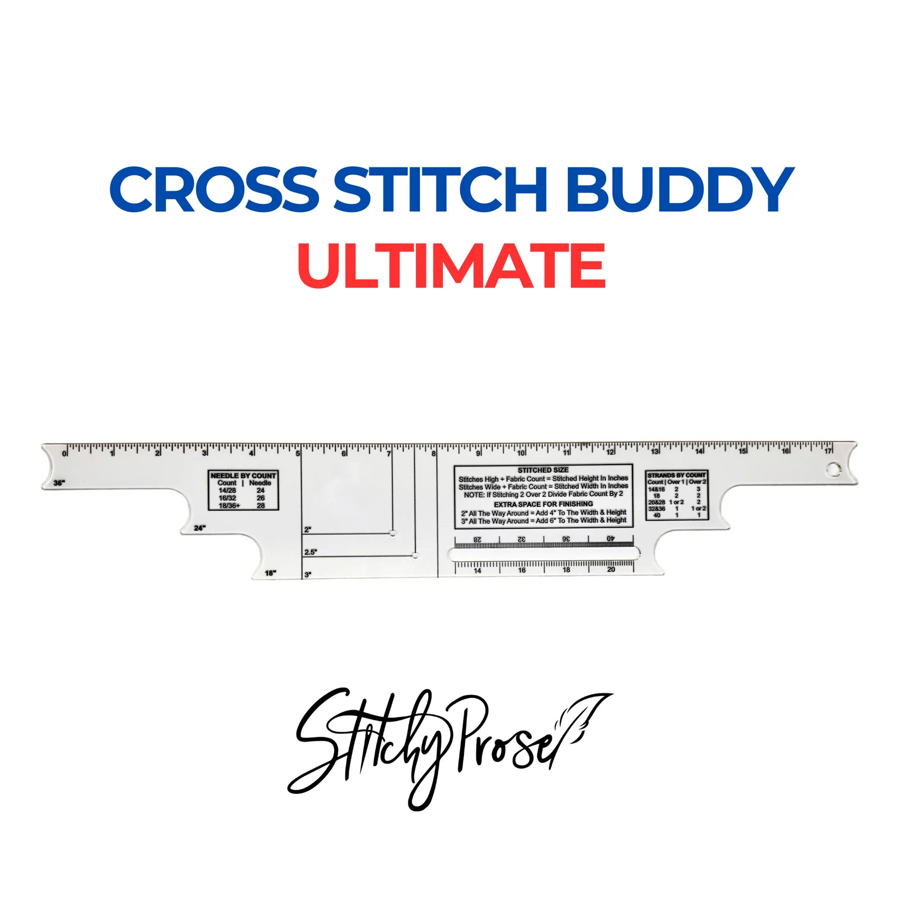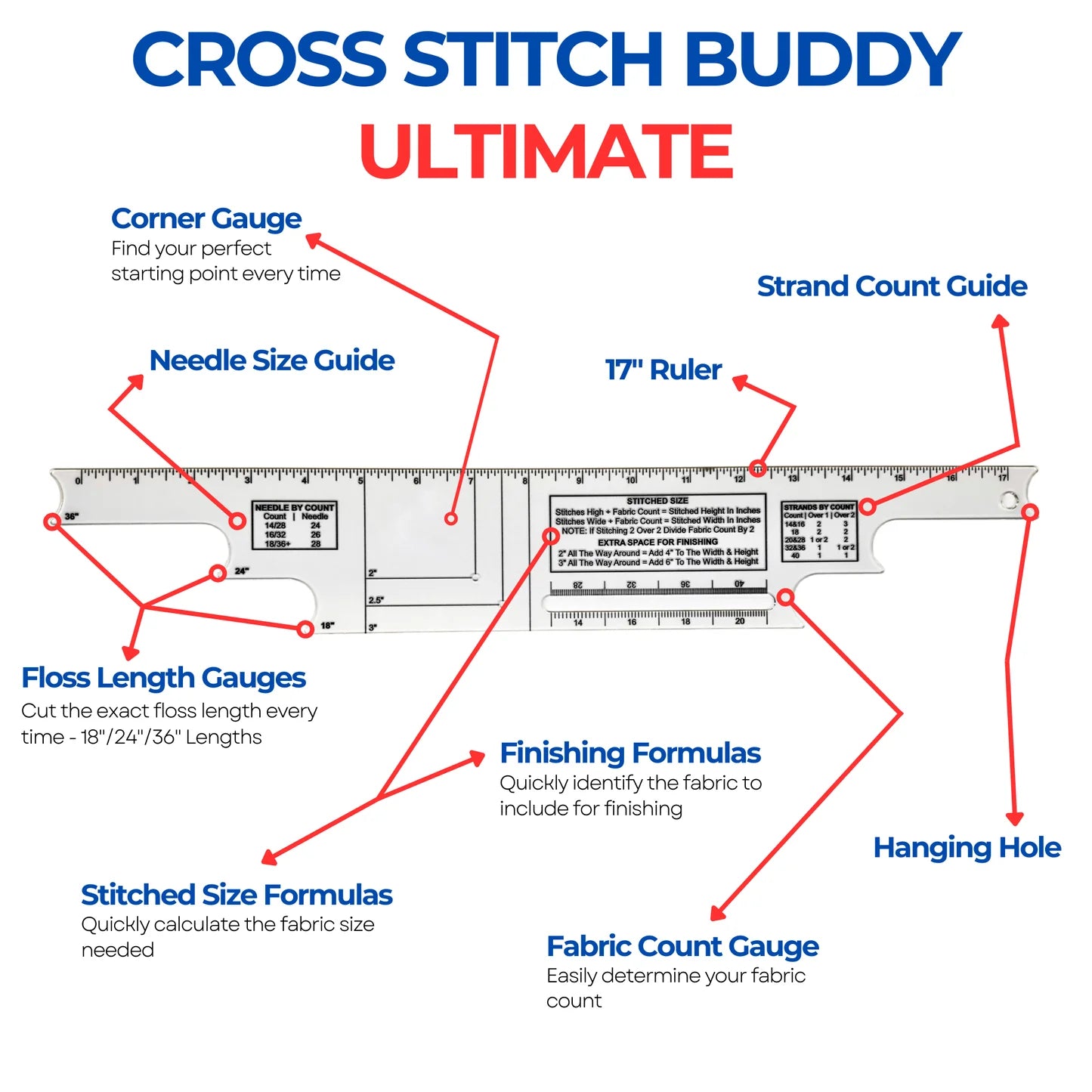 The Cross Stitch Buddy - Ultimate includes a built-in corner gauge, stitched and finishing size formulas, 17” ruler, a winder to cut your thread to 18”, 24” or 36” lengths, a strand and needle guide for different fabric counts, a fabric count gauge, and a hole to hang the tool on your wall.