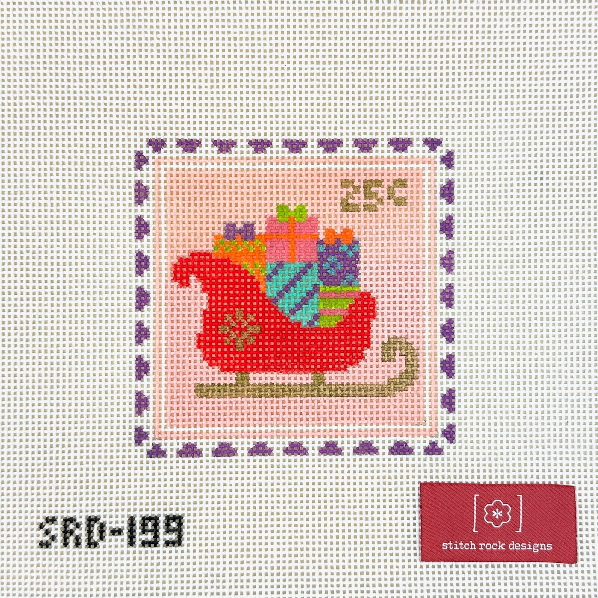 This is a hand painted needlepoint canvas from Stitch Rock Designs. It features a stamp with a sleigh full of presents on it.
