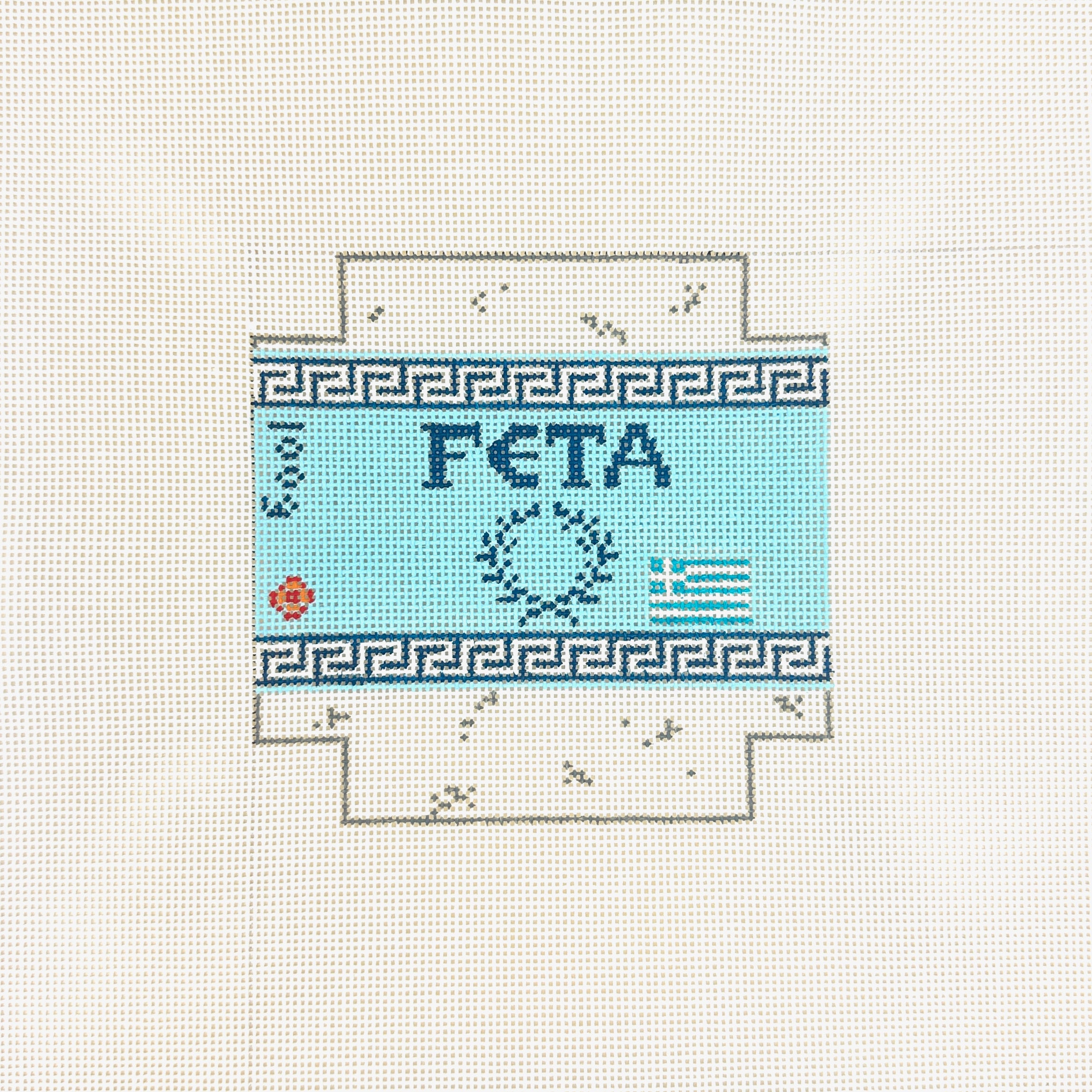 This is a hand painted needlepoint canvas by Alli Eagan for Stitch Style. It features a 3D wedge of feta cheese.