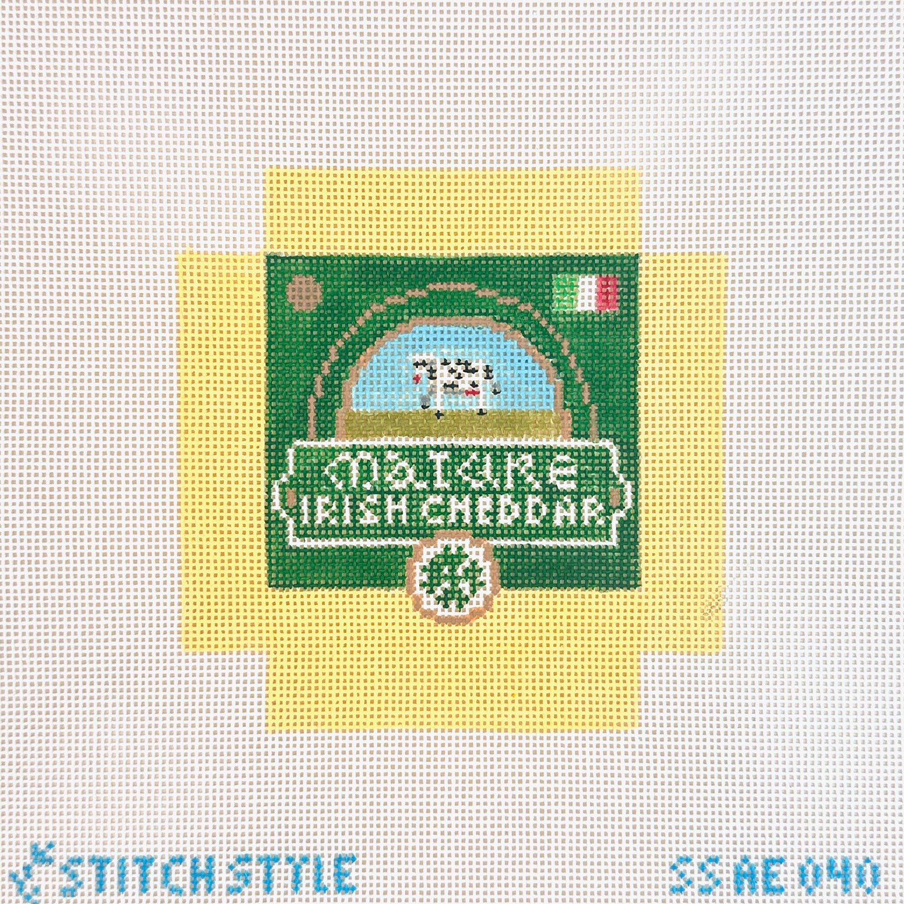 This is a hand painted needlepoint canvas by Alli Eagan for Stitch Style. It features a 3D wedge of Irish cheddar cheese.