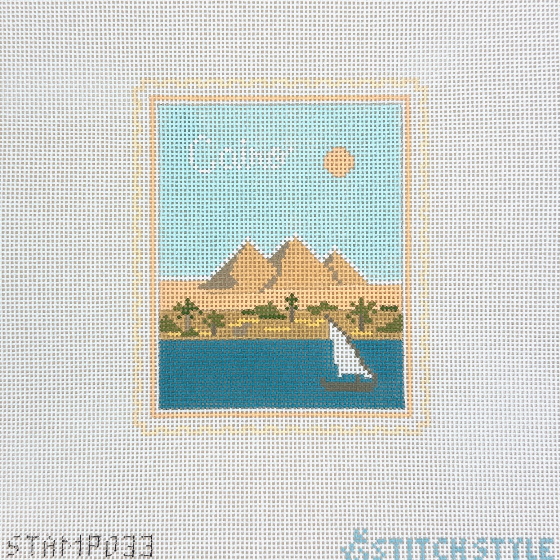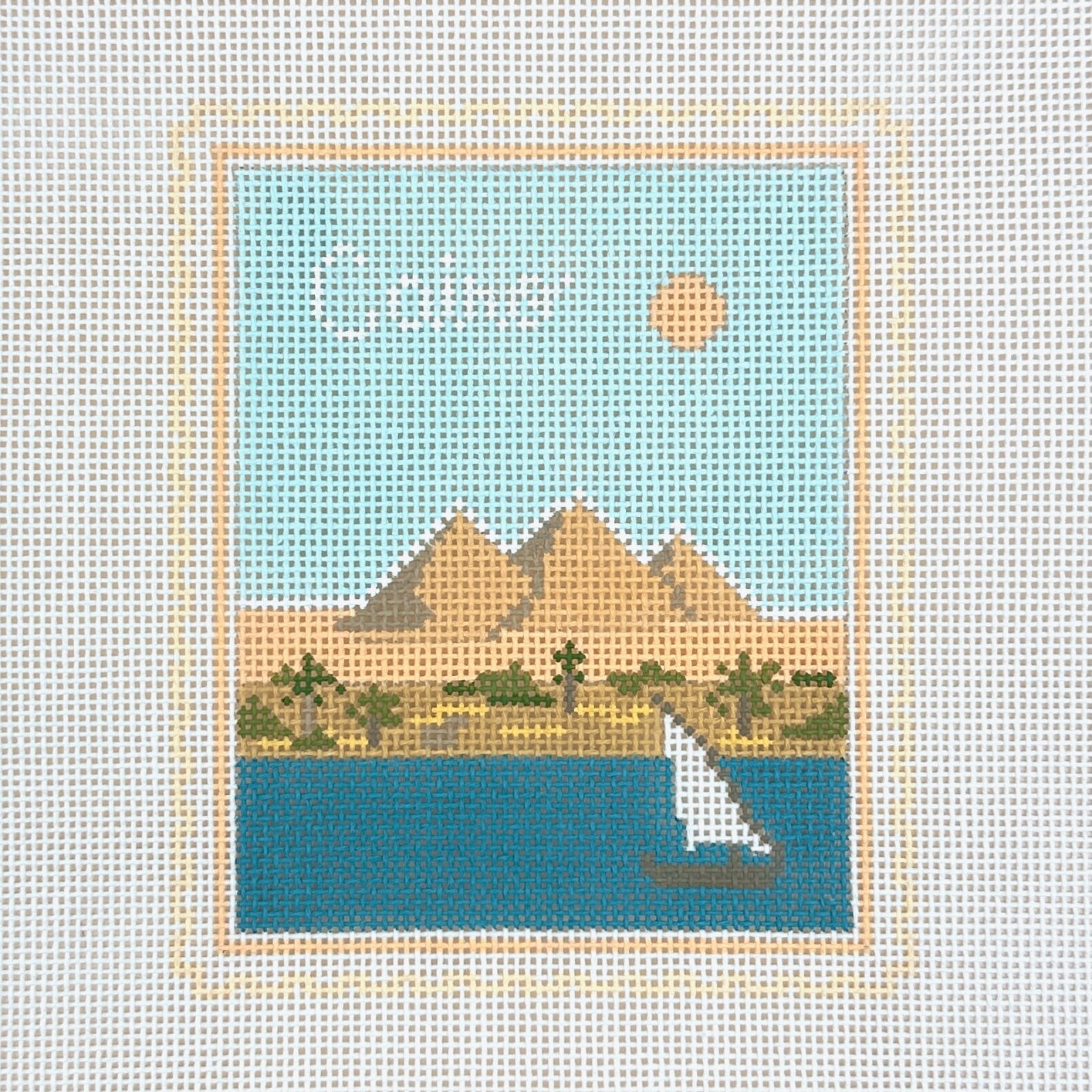 This is a hand painted needlepoint canvas from Stitch Style. It features a stamp with a view of the pyramids in Cairo.
