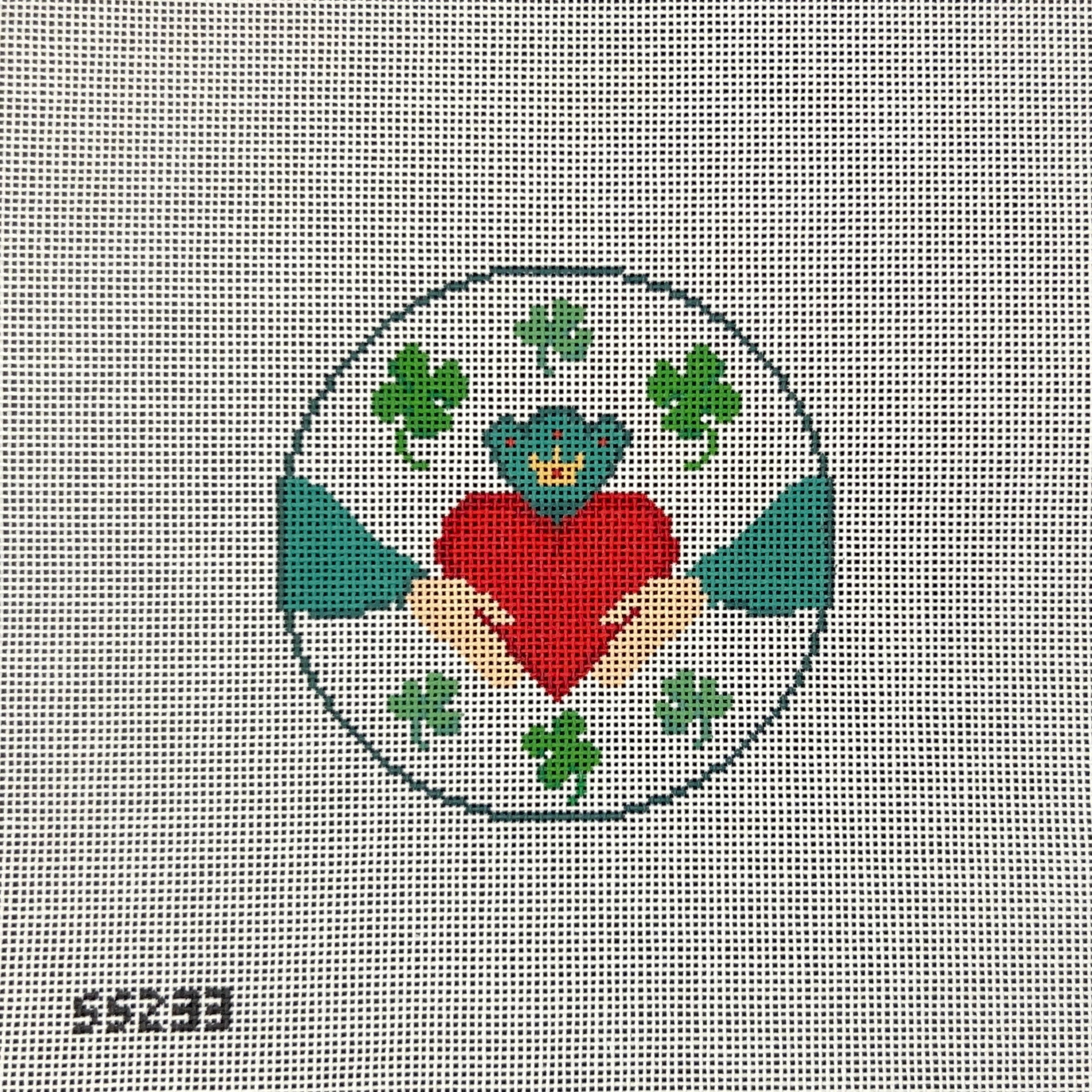 This is a hand painted needlepoint canvas by Stitch Style. It is a stitch painted circular design featuring a Claddagh surrounded by clovers. The Claddagh is an Irish icon and symbol of love, loyalty, and friendship.