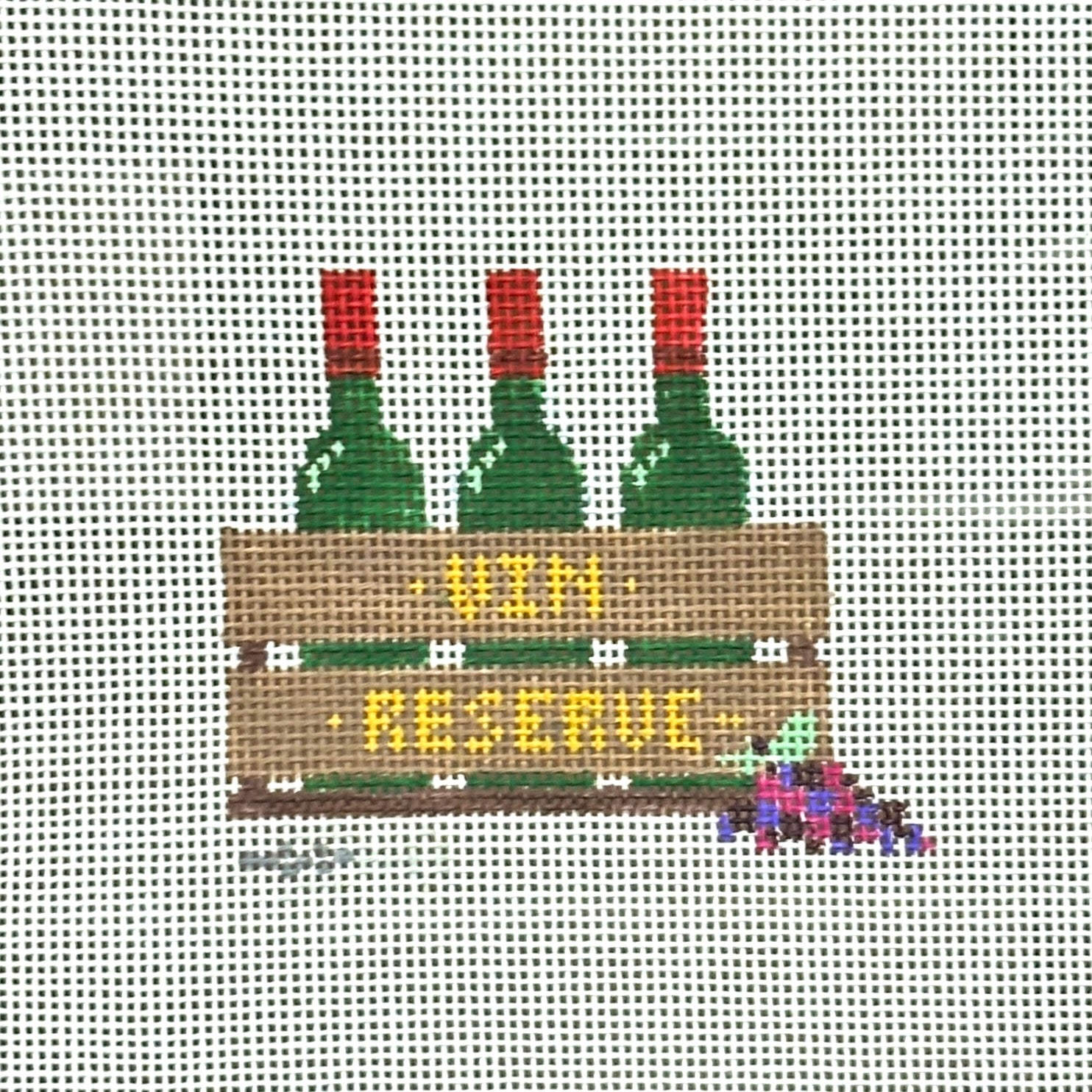 This hand painted needlepoint canvas by Alli Eagan for Stitch Style features a crate of wine bottles.