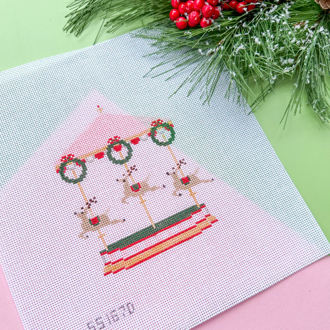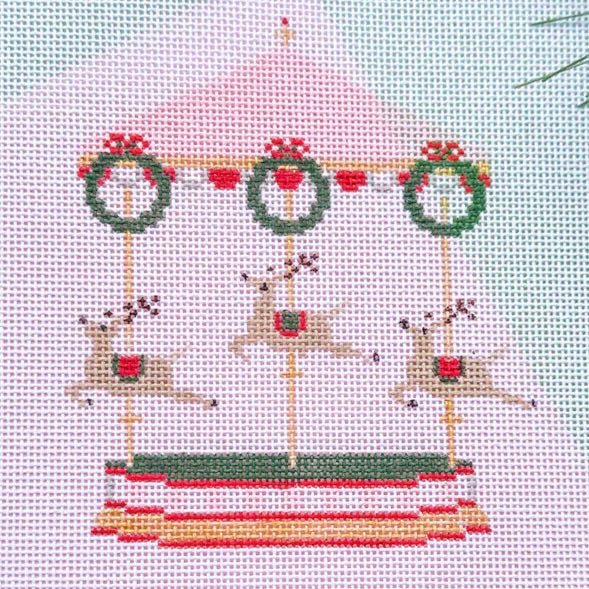 This hand painted needlepoint canvas by Stitch Style features a lovely carousel with Christmas reindeers. A stitch guide is not included with this style.