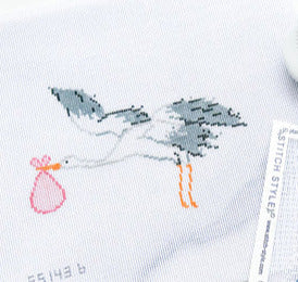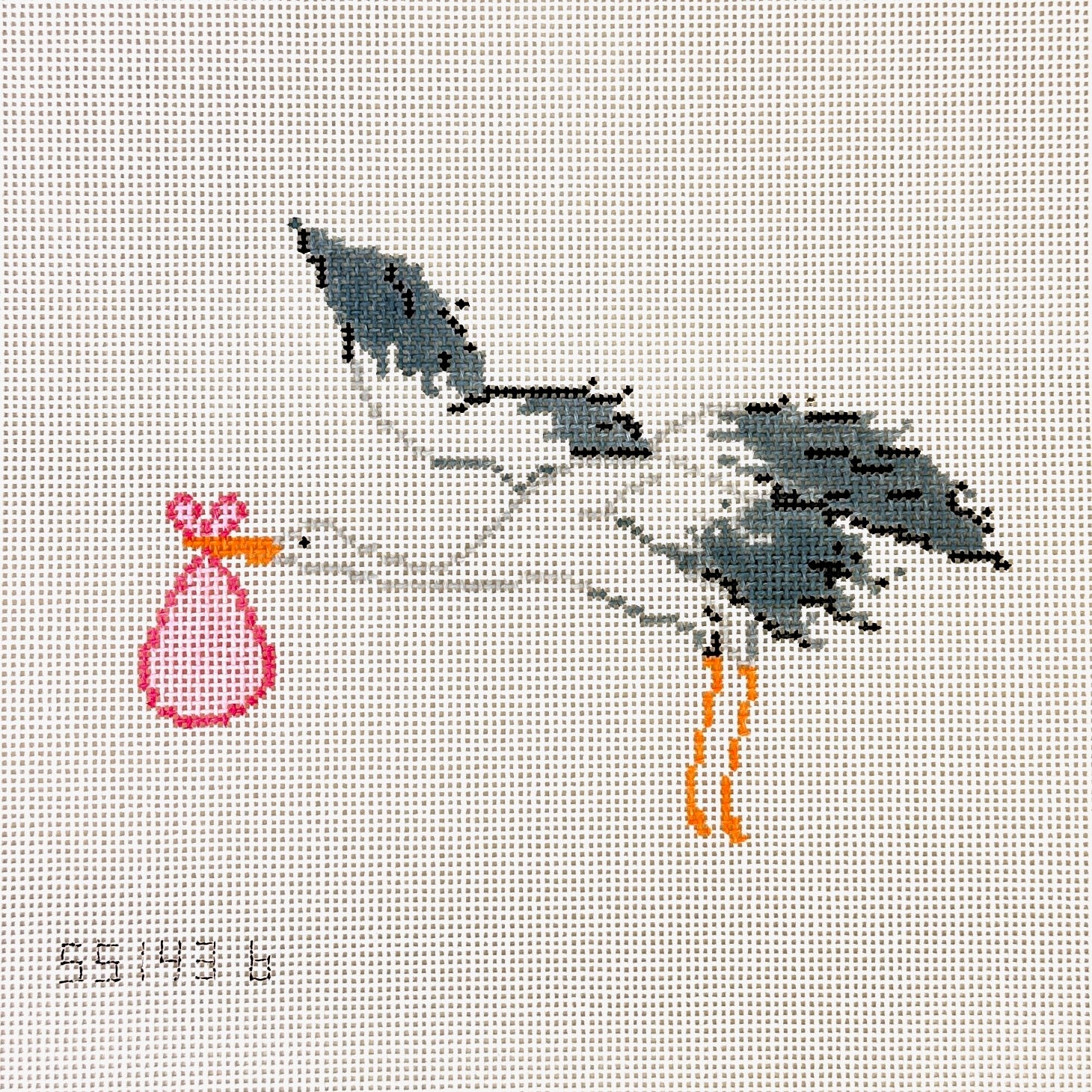 By Stitch Style, this hand painted needlepoint canvas features a stork carrying a special delivery in a pink bundle. A stitch guide is included.