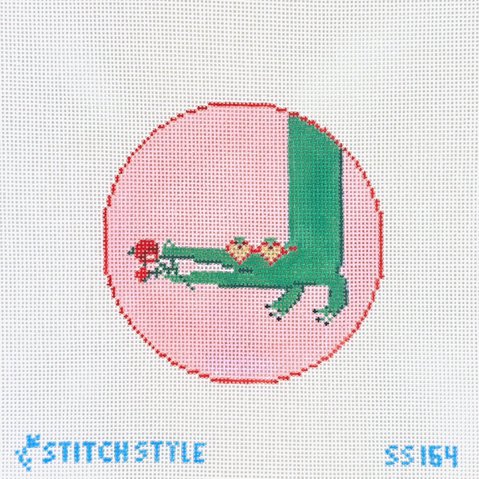 This is a hand painted needlepoint canvas by Stitch Style. It features a gator with hearts for Valentine’s Day.