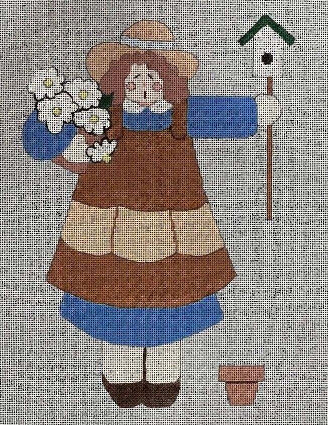 This hand painted needlepoint canvas by Stitches in Time Designs features a gardener lady with birdhouse.
