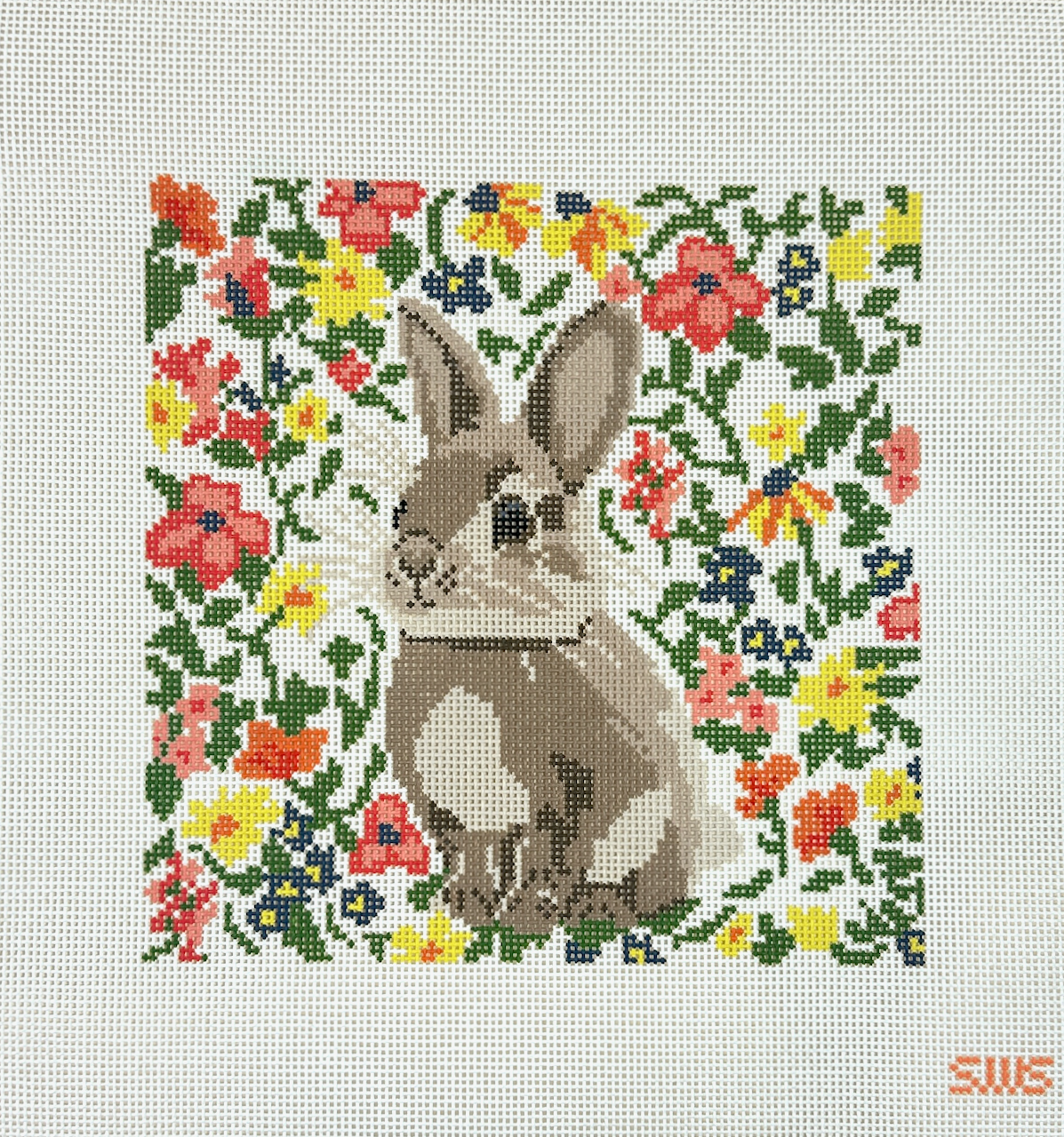 This is a hand painted needlepoint canvas by Stitching with Stacey. It features a painting of a cute bunny surrounded by a floral background.
