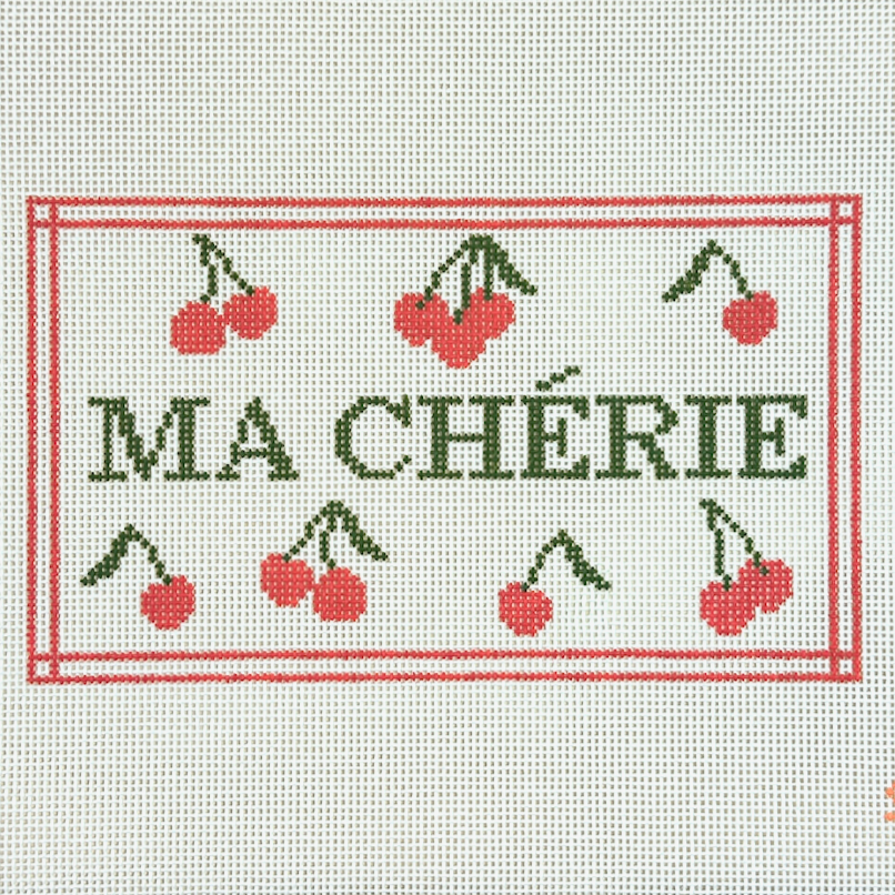 This is a hand painted needlepoint canvas by Stitching with Stacey. It features the text "Ma Cherie" surrounded by cherries inside a red border. It means my darling in French used for feminine subjects. See the Mon Cheri for the masculine version.