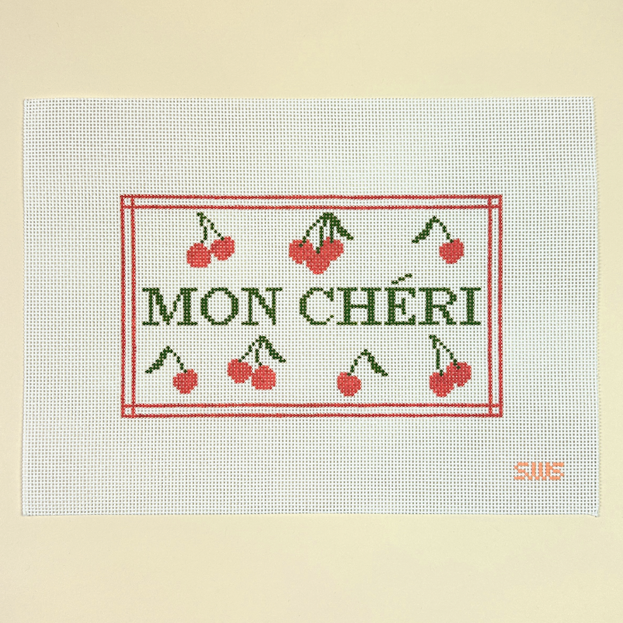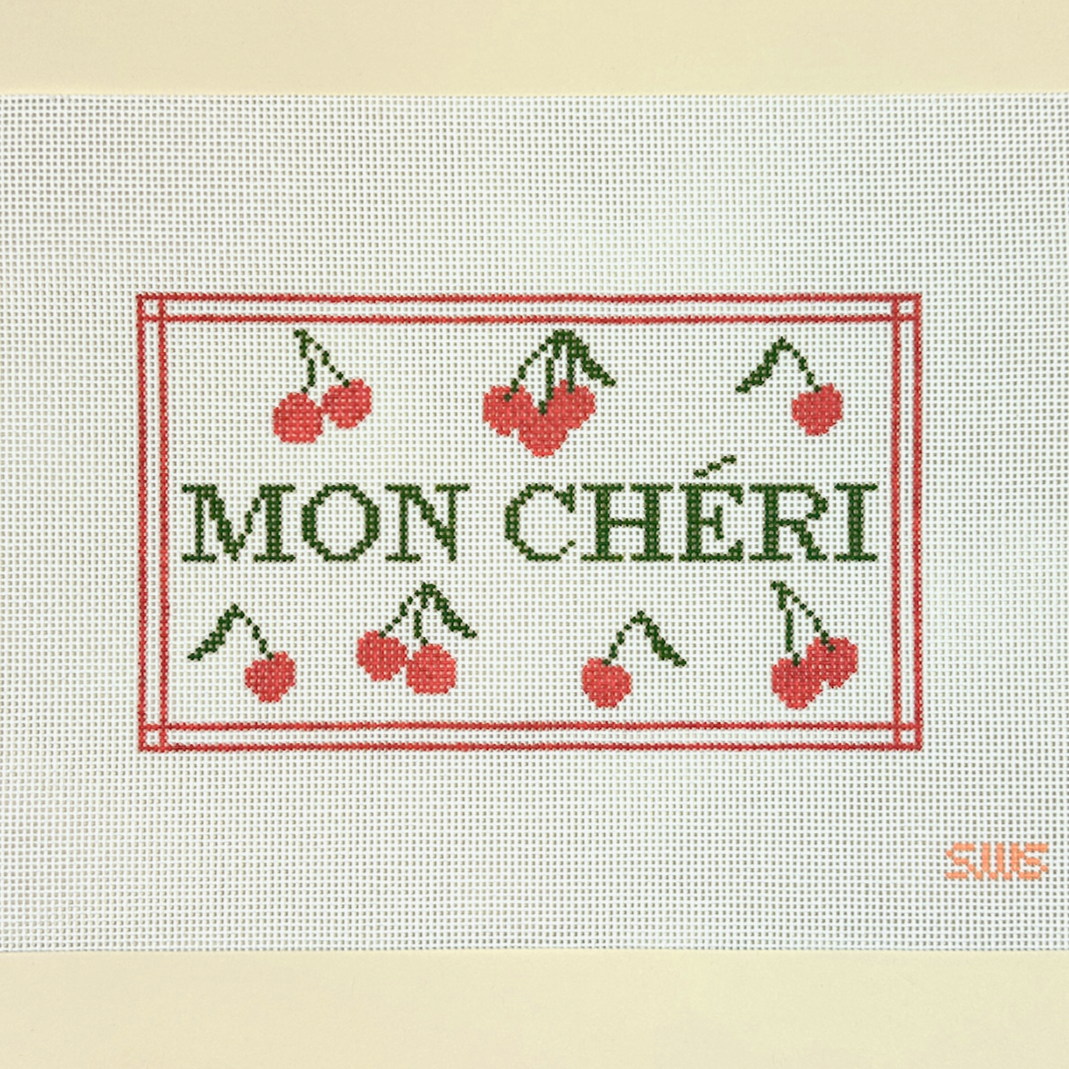 This is a hand painted needlepoint canvas by Stitching with Stacey. It features the text "Mon Cheri" surrounded by cherries inside a red border. It means my darling in French used for masculine subjects. See the Ma Cherie for the feminine version.